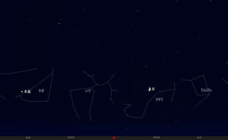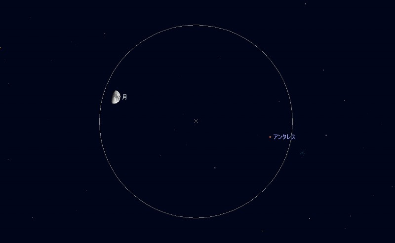 ![]() 2009年8月28日19時30分ごろの南の空。 (月齢8.0) ![]() 月とアンタレス。 (視野円7度) |