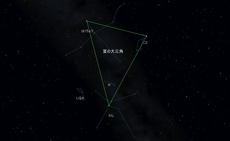 ![]() 8月下旬21時ごろ、 身体を南に向けて見上げた時の様子。 夏の大三角形がちょうど南中しています。 わし座のアルタイルを頼りに、 いるか座の菱形を探してみましょう。 ![]() いるか座はこじんまりとした星座。 視野円7度の円に収まってしまいます。 ![]() アリオンを助けたイルカの姿とも言われています。 |
