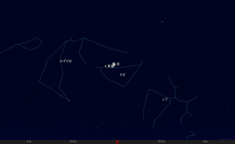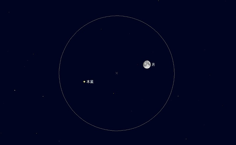 ![]() 2009年9月2日22時ごろの南の空。 (月齢13.1) ![]() 満月前の月と木星 (視野円7度) |