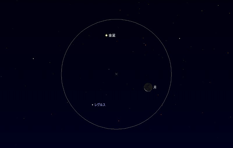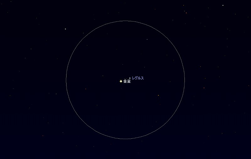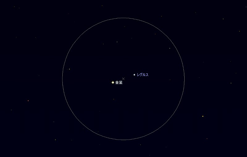 ![]() 2009年9月21日4時ごろの東の空。 ![]() 金星とレグルスが超接近。 (視野円7度) ![]() 金星とレグルスの角距離は約1.5度 (視野円3度) |