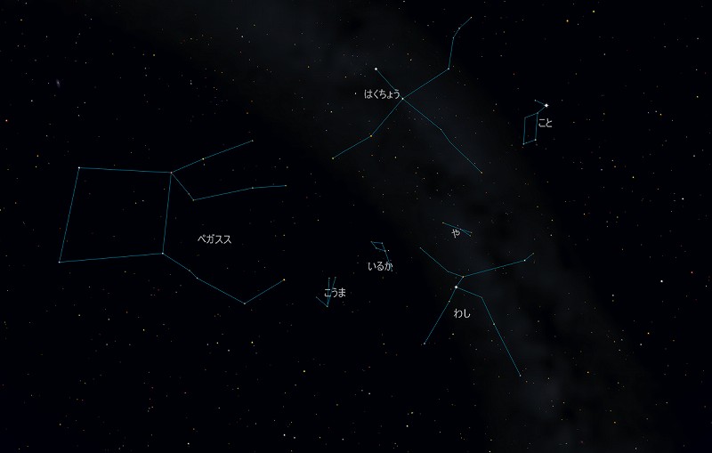 ★彡〜☆彡〜★彡〜☆彡〜★彡〜☆彡〜★彡〜☆彡〜★彡〜☆彡〜★彡〜☆彡 今宵はどんな星空が見えるでしょう。。。 ☆彡 流 れ 星 か ら の 贈 り 物 ★彡 第203号 2009年9月14日発行 ☆彡〜★彡〜☆彡〜★彡〜☆彡〜★彡〜☆彡〜★彡〜☆彡〜★彡〜☆彡〜★彡 こんにちは。 「流れ星」の鈴木です。 引き続き、ご愛読いただいている方々はもちろん、 新しく読者登録していただいた皆さん、 本当にありがとうございます。 宇宙ステーション補給機(HTV)技術実証機を乗せた H2Bロケット試験機が9月11日2時1分46秒、 種子島宇宙センターから打ち上げられました。 HTVは、来年2010年に運用が終了するスペースシャトルに代わって、 宇宙ステーションへの物資輸送の中核になることが期待されています。 今回の打ち上げ成功は、NASA幹部も高い評価をしてるようです。 なお、HTVは18日にISSへ到着する予定です。 【関連リンク】 日本の宇宙ステーション補給機、打ち上げ成功!(アストロアーツ) http://www.astroarts.co.jp/news/2009/09/11htv_launch/ 宇宙ステーション補給機 HTV(JAXA) http://www.jaxa.jp/countdown/h2bf1/overview/htv_j.html 日本初 宇宙ステーション補給機HTVプロジェクトの軌跡(JAXA) http://www.youtube.com/watch?v=rWOZRXiGyoE ↑HTVの紹介動画。必見です! それでは、今週もよろしくお願いします☆彡 ★彡〜☆彡〜★彡〜☆彡〜★彡〜☆彡〜★彡〜☆彡〜★彡〜☆彡〜★彡〜☆彡 ☆今週の話題 ☆彡〜★彡〜☆彡〜★彡〜☆彡〜★彡〜☆彡〜★彡〜☆彡〜★彡〜☆彡〜★彡 ☆1.細〜い月、金星、レグルスが集まります(17日 明け方) ☆2.金星とレグルスが超接近します(21日 明け方) ☆3.地味な星座しりぃず その16 こうま座 ☆4.編集後記 ★彡〜☆彡〜★彡〜☆彡〜★彡〜☆彡〜★彡〜☆彡〜★彡〜☆彡〜★彡〜☆彡 ☆1.細〜い月、金星、レグルスが集まります(17日 明け方) ☆彡〜★彡〜☆彡〜★彡〜☆彡〜★彡〜☆彡〜★彡〜☆彡〜★彡〜☆彡〜★彡 17日の明け方、 新月直前の細〜い月と、明けの明星(金星)、 しし座1等星レグルスが 東の空で集まります。 眩しい金星の光を灯台代わりに、 月とレグルスが寄り添う様子をご覧ください。 17日未明4時ごろの東の空の様子はコチラ。 http://nagarebosi-kirari.com/mailmaga/20090914.html#01 ★彡〜☆彡〜★彡〜☆彡〜★彡〜☆彡〜★彡〜☆彡〜★彡〜☆彡〜★彡〜☆彡 ☆2.金星とレグルスが超接近します(21日 明け方) ☆彡〜★彡〜☆彡〜★彡〜☆彡〜★彡〜☆彡〜★彡〜☆彡〜★彡〜☆彡〜★彡 そして、明けの明星である金星は、 徐々にレグルスへと近づいていき、 21日の明け方には、 約0.5度まで超接近します。 17日の段階では、 両者は4.5度ほど離れていたので、 金星は1日に1度ずつレグルスに近づいていたわけです。 もちろん、これからは、 どんどん離れていってしまうわけですけど。 21日未明4時ごろの東の空の様子はコチラ。 http://nagarebosi-kirari.com/mailmaga/20090914.html#02 ★彡〜☆彡〜★彡〜☆彡〜★彡〜☆彡〜★彡〜☆彡〜★彡〜☆彡〜★彡〜☆彡 ☆3.地味な星座しりぃず その16 こうま座 ☆彡〜★彡〜☆彡〜★彡〜☆彡〜★彡〜☆彡〜★彡〜☆彡〜★彡〜☆彡〜★彡 今回は、あまり間髪いれずにやってまいりました 「地味な星座しりぃず」です。 16回目にご紹介するジミストさんは、コチラ! こうま座 です ♪おうまのおやこは なかよしこよし いつでもいっしょに ぽっくりぽっくりあるく (童謡:おうま) 唱歌:おうま(YOUTUBE) http://www.youtube.com/watch?v=_ezEgC8nKiE こうま座は、前回その15でお話しした「いるか座」と、 ペガスス座の頭に挟まれた、これまた小さな星座。 それもそのはず、 赤経・赤緯で区切られた星座領域としても、 88星座の中で2番目の小ささを誇ります。 (1番小さい星座は、みなみじゅうじ座。) こうま座は、紀元前2世紀、古代ギリシャ時代の 天文学者ヒッパルコスによって設定され、 2世紀のプトレマイオス(トレミー)がまとめた48星座にも、 その名を連ねる古い星座。 こうま座は、 α星キタルファですら4等級で、 ジミストらしくあまり目立ちません。 α星、β星、δ星、γ星を繋いだいびつな台形は 視野7度の円にすっぽりと収まります。 そんな小さな星座に馬の全身があるわけはなく、 では、一体どんな姿をしているのかといいますと、 はい、馬の頭の部分だけです。 α星キタルファの名前の由来が、 アラビア語で「馬の一部」という意味の 「アル・キトア・アル・ファラス」からきていることも 納得できるでしょうか。 ぺガスス座よりも頭1つ分だけ先を走ることもあり、 初秋を告げる小さな使者といった感もある、こうま座。 一説によれば、この馬は、 商業・伝令の神ヘルメスが、 ふたご座の兄で馬術の名手カストルに贈った 名馬と言われています。 (ヘルメスではなくアポロンという説もあり。) そして、実は、この馬、 ペルセウスやベレロポンという英雄に乗り操られた 天馬ペガススの弟ケレリスとも。 兄弟仲良く、秋の夜空を駆けているのでしょうか。。。 9月中旬21時ごろのこうま座の位置はコチラ。 http://na