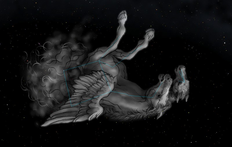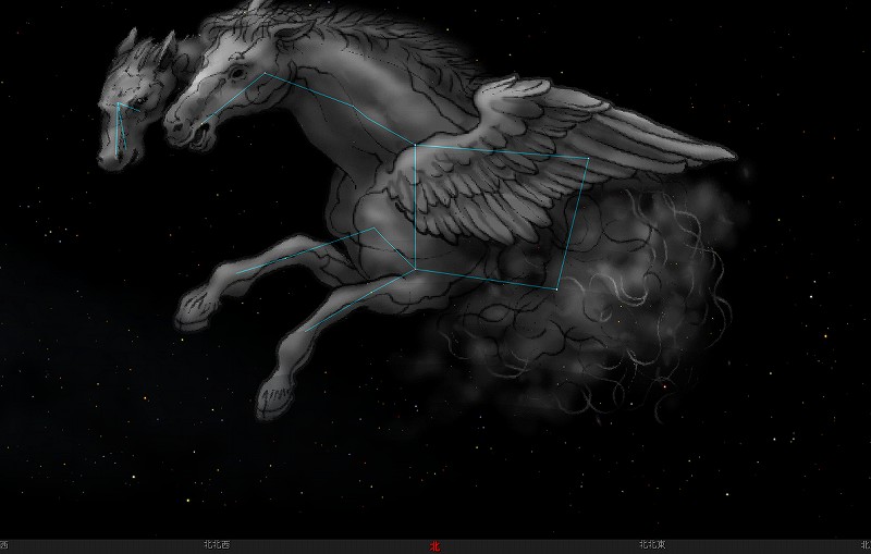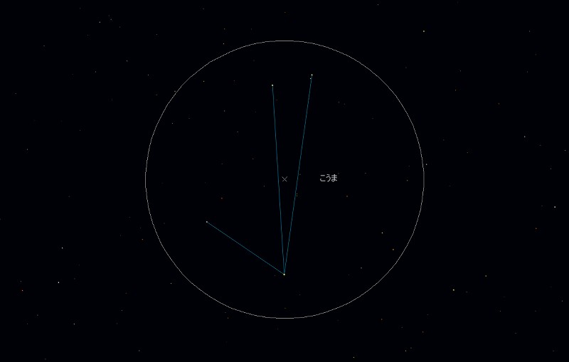 ![]() 9月中旬21時ごろ、 身体を南に向けて上を見上げた時の様子。 こうま座は、いるか座とぺガスス座の頭に挟まれています。 ![]() 視野円7度にスッポリ入ってしまう可愛らしさ。 ![]() 一説には、こうま座は、 ペガススの弟ケレリスの姿とも言われています。 兄弟仲良く、ヒヒーーン! ![]() 南半球では、北の地平線を駆ける姿になります。 図は、9月中旬0時ごろのシドニーでの様子。 (現地時間) |