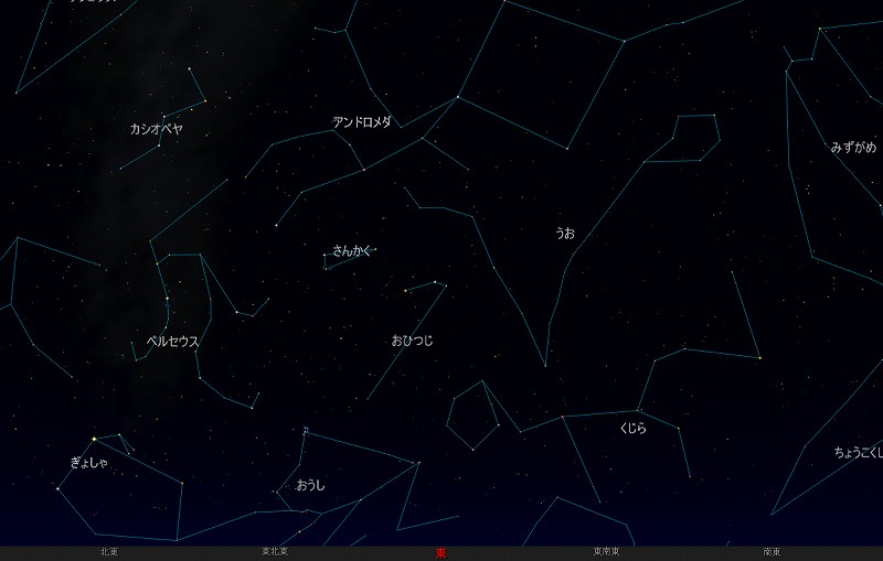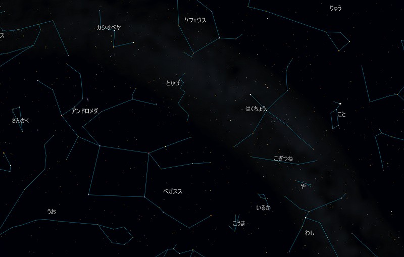 ![]() 2009年10月の星空の様子 南の空 上旬21時ごろ 中旬20時ごろ 下旬19時ごろ (以下、同様) ![]() 南〜天頂 ![]() 東の空 ![]() 北の空 ![]() 西の空 ![]() 星座早見 (南が下) |