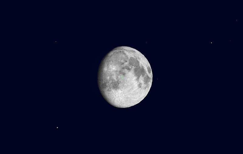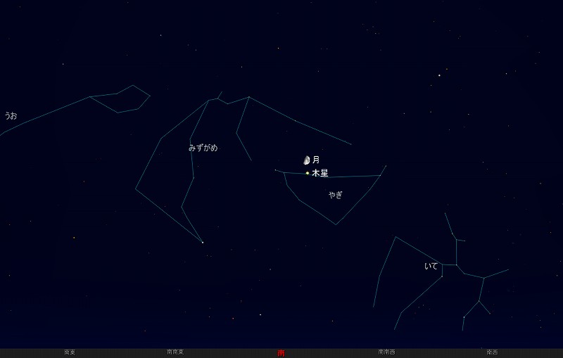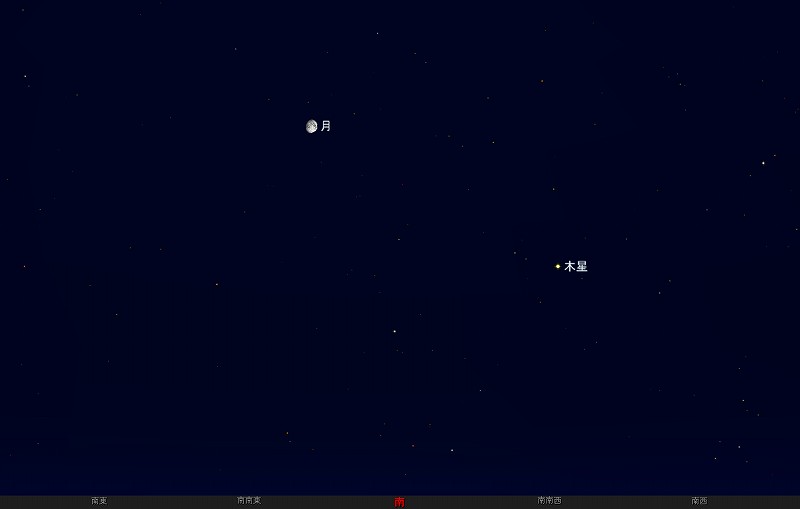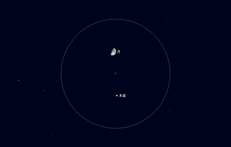 ![]() 2009年10月27日19時ごろの南の空。 (月齢9.2) ![]() 上弦すぎの月と木星。 (視野円7度) |
