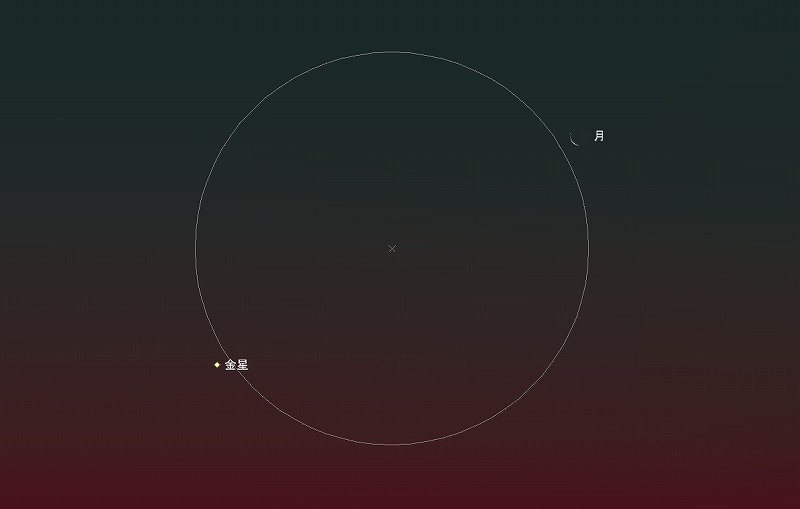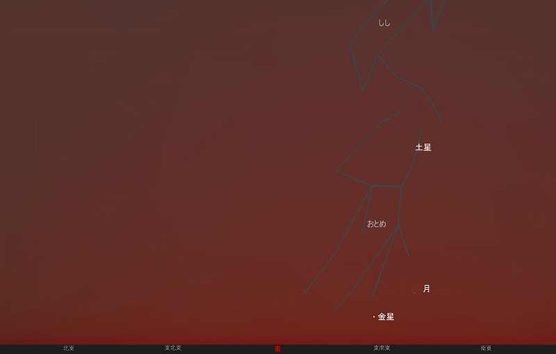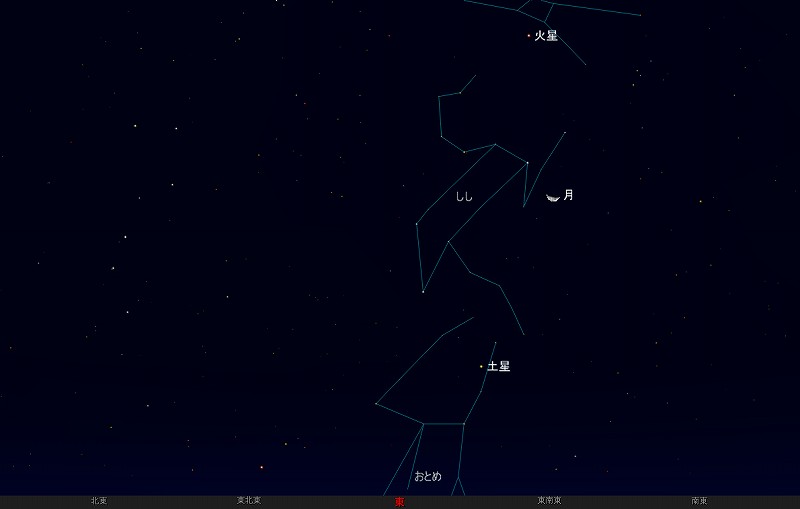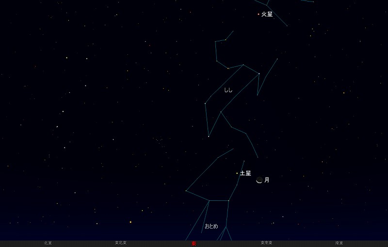 ![]() 2009年11月11日早朝4時ごろの東の空。 (月齢23.6) ![]() 月とレグルス (視野円7度) ![]() 2009年11月13日早朝4時ごろの東の空。 (月齢25.6) ![]() 逆三日月と土星 (視野円10度) ![]() 2009年11月15日早朝5時30分ごろの東の空。 (月齢27.6) ![]() 新月直前の月と金星 (視野円10度) |