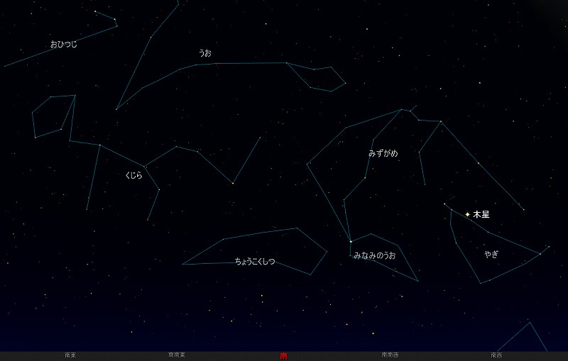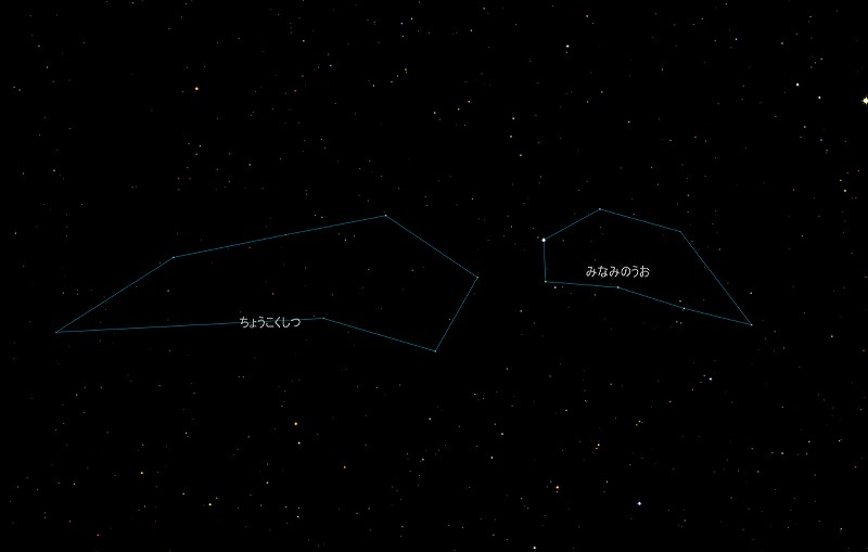 ![]() 2009年11月中旬20時ごろの南の空。 みなみのうお座のフォーマルハウトの東側一帯が 「ちょうこくしつ座」です。 主な恒星は4等級台で目立ちません。 ![]() 星座絵が見やすいように縦にしました。 この星座を設定したラカーユは「彫刻家のアトリエ座」と名付けました。 ![]() 繋ぎ方によっては、 みなみのうお座を線対称にして大きくしたようにも見えますね。 |