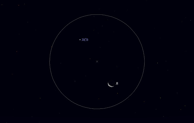 ![]() 2009年12月12日早朝4時30分ごろの南東の空。 (月齢25.0) ![]() 逆三日月とスピカ(おとめ座1等星) (視野円7度) |