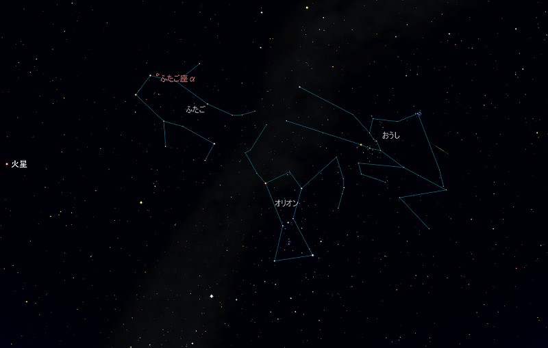 ★彡〜☆彡〜★彡〜☆彡〜★彡〜☆彡〜★彡〜☆彡〜★彡〜☆彡〜★彡〜☆彡 今宵はどんな星空が見えるでしょう。。。 ☆彡 流 れ 星 か ら の 贈 り 物 ★彡 第215号 2009年12月7日発行 ☆彡〜★彡〜☆彡〜★彡〜☆彡〜★彡〜☆彡〜★彡〜☆彡〜★彡〜☆彡〜★彡 こんにちは。 「流れ星」の鈴木です。 引き続き、ご愛読いただいている方々はもちろん、 新しく読者登録していただいた皆さん、 本当にありがとうございます。 日本人宇宙飛行士として2人目のISS長期滞在員となる 野口聡一の打ち上げが21日に予定されました。 野口さんがISSへ向かうために使用するのは、 NASAのスペースシャトルではなく、ロシアのソユーズ。 ソユーズに搭乗するのは日本人として2人目となります。 2人目? そうです。 19年前の1990年12月2日、 当時TBS社員だった秋山豊寛さんが、 ソユーズに乗って、日本人で初めて宇宙へ行きました。 憶えていますか? TBSは宇宙での秋山さんの様子を連日、伝えていました。 これを記念して、12月2日は、 「日本人宇宙飛行記念日」になっています。 【関連リンク】 ソユーズロケットの概要(JAXA) http://iss.jaxa.jp/iss/supply/soyuz.html それでは、今週もよろしくお願いします☆彡 ★彡〜☆彡〜★彡〜☆彡〜★彡〜☆彡〜★彡〜☆彡〜★彡〜☆彡〜★彡〜☆彡 ☆今週の話題 ☆彡〜★彡〜☆彡〜★彡〜☆彡〜★彡〜☆彡〜★彡〜☆彡〜★彡〜☆彡〜★彡 ☆1.逆三日月とスピカが並びます(12日未明) ☆2.ふたご座流星群が極大 狙い目は13〜14日 ☆3.国際宇宙ステーションを見よう! ☆4.編集後記 ★彡〜☆彡〜★彡〜☆彡〜★彡〜☆彡〜★彡〜☆彡〜★彡〜☆彡〜★彡〜☆彡 ☆1.逆三日月とスピカが並びます(12日未明) ☆彡〜★彡〜☆彡〜★彡〜☆彡〜★彡〜☆彡〜★彡〜☆彡〜★彡〜☆彡〜★彡 冬が本番を迎えようとしていますけど、 未明には、春の星座も東の空から顔を出し、 明け方には、大きなおとめ座もすっかり姿を表します。 12日明け方には、 おとめ座1等星スピカと逆三日月が仲良く並びます。 ちょっと早めに春の気分を味わうのもいいでしょう。 12日4時30分ごろの南東の空の様子はコチラ。 http://nagarebosi-kirari.com/mailmaga/20091207.html#01 ★彡〜☆彡〜★彡〜☆彡〜★彡〜☆彡〜★彡〜☆彡〜★彡〜☆彡〜★彡〜☆彡 ☆2.ふたご座流星群が極大 狙い目は13〜14日 ☆彡〜★彡〜☆彡〜★彡〜☆彡〜★彡〜☆彡〜★彡〜☆彡〜★彡〜☆彡〜★彡 ふたご座流星群は、 コンスタントに流星が出現することで知られていて、 1月のしぶんぎ座流星群、 8月のペルセウス座流星群と並んで、 3大流星群の1つとなっています。 ふたご座流星群の特徴は次のとおり。 1.活動期間は12月の5日ごろ〜18日ごろ。 2.極大(ピーク)は13日〜15日ごろ。 3.放射点(流星が飛ぶ中心点)が日没後まもなくから天空にあるため、 一晩中ゆっくりと観察できる。 4.深夜に放射点が天頂付近を通るため、 どの方向へも流星が飛び、観察しやすい。 5.流星の特徴は「やや速い」。 6.ピーク時は1時間に20〜30個ほどの流星が見られる。 7.時期的に冬型気候のため、 日本の太平洋側では、晴天確率が高く、空の透明度も良い。 8.近年では、特に活動が活発となっていて、 明るい流星も目立ってきている。 今年2009年の極大予想は14日の昼間なので、 実際には、13日夜、14日夜が狙い目となりそうです。 今年は、16日が新月のため、 13日と14日とも明け方に細い月が昇り始める程度なので、 月明かりを気にしなくてすむ良好な条件です。 昨年2008年は満月が煌々と照らす中での流星群だったので、 そのリベンジになるといいですね。 とすれば、問題は、ただ1つ、 「とにかく寒い!」ということだけ。 天気が良ければ良いほど、 明け方に向かってどんどん冷え込みが増します。 ただ、こればかりは如何ともし難いわけで。。。 当たり前ですけど、 防寒対策は自分自身でしっかりと行なうしかありません。 根を詰めて一晩中、見る必要はないわけですし、 とにかく充分すぎるくらいの暖かい格好をして、 見られる時間だけ外に出るなど、 出来る範囲で観察してみると良いでしょう。 あまり過度な期待はせぬよう。。。 13日〜14日、 21時、0時、3時ごろのふたご座と放射点の位置はコチラ。 http://nagarebosi-kirari.com/mailmaga/20091207.html#02 【関連リンク】 2007年 ふたご座流星群ギャラリー(アストロアーツ) http://www.astroarts.co.jp/gallery/meteor/gem/2007gem/ 2008年 ふたご座流星群ギャラリー(アストロアーツ) http://www.astroarts.co.jp/gallery/meteor/gem/2008/ ★彡〜☆彡〜★彡〜☆彡〜★彡〜☆彡〜★彡〜☆彡〜★彡〜☆彡〜★彡〜☆彡 ☆3.国際宇宙ステーションを見よう! ☆彡〜★彡〜☆彡〜★彡〜☆彡〜★彡〜☆彡〜★彡〜☆彡〜★彡〜☆彡〜★彡 ★場所|★見始時間(方角/高さ) |★最大高さ(方角/高さ) <8日> 札 幌|06:05(南西/13度) |06:07(南東/47度) 秋 田|06:04(南西/11度) |06:06(南/75度) 仙 台|06:04(西南西/12度)|06:06(北西/72度) 東 京|06:03(西南西/13度)|06:06(北北西/50度) 金 沢|06:03(南西/12度) |06:05(西南西/86度) 大 阪|06:02(南西/12度) |06: