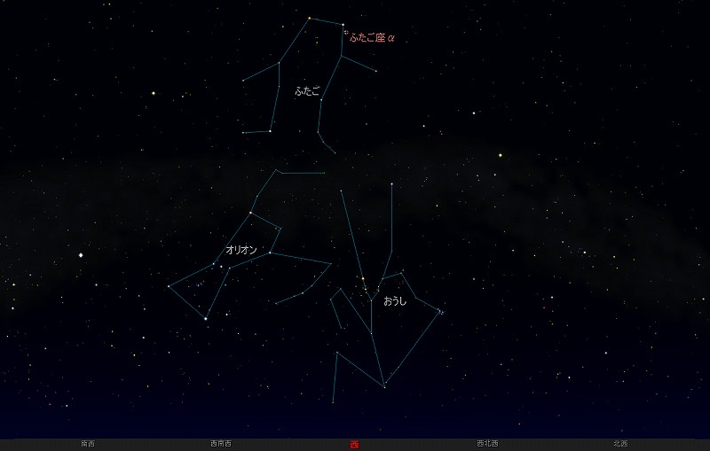 ![]() 2009年12月13日、14日21時ごろの東の空。 ふたご座は既に昇っています。 ![]() 同0時(24時)ごろ、南に身体を向けて上を見上げた時の様子。 ふたご座はほぼ南中。 ![]() 同3時(27時)ごろの西の空。 ![]() 2009年は月明かりもなく条件が良い「ふたご座流星群」。 近年は比較的活発な出現を見せています。 さて、どうなりますか。。。 ふたご座の位置は1時ごろ。 (図はあくまでもイメージです。) |
