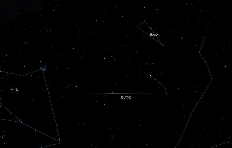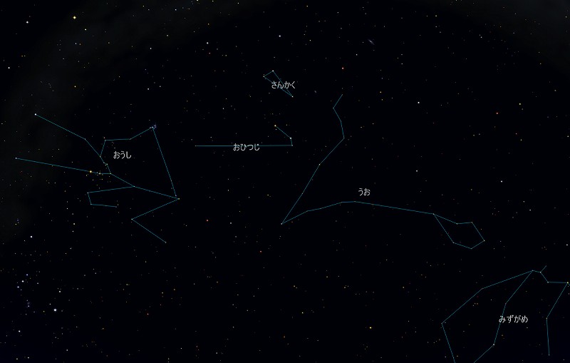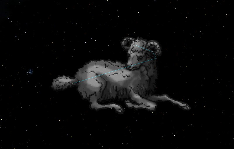 ![]() 12月中旬20時ごろ、身体を南に向けて上を見上げた時の様子。 おひつじ座が南中しています。 ![]() おひつじ座は、 黄道星座の1番目でありながら、とっても控え目。 さんかく座とすばる(プレアデス星団)を目安に、 位置の見当をつけると良いでしょう。 ![]() おとなしそうに横座りする羊は、 ギリシャ神話では金毛の牡羊なんだとか。。。 |