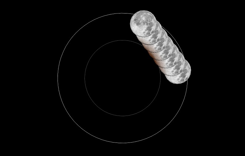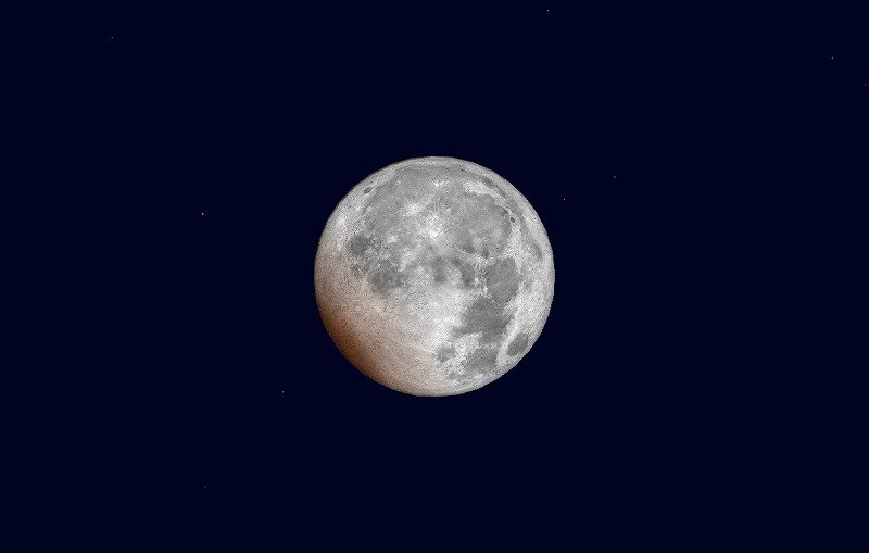 ![]() 2010年1月1日未明3時50分の西の空。 (月齢15.3 満月) 部分月食の始まりは3時52分。 ![]() 4時22分、食の最大 ![]() 食最大時の月の様子 ![]() 3時30分から20分おきの月の移動の様子。 (月は下から上へ移動。) 大きい円は月の半影、 小さい円は月の本影です。 月が本影をかすめていくのが分かります。 |