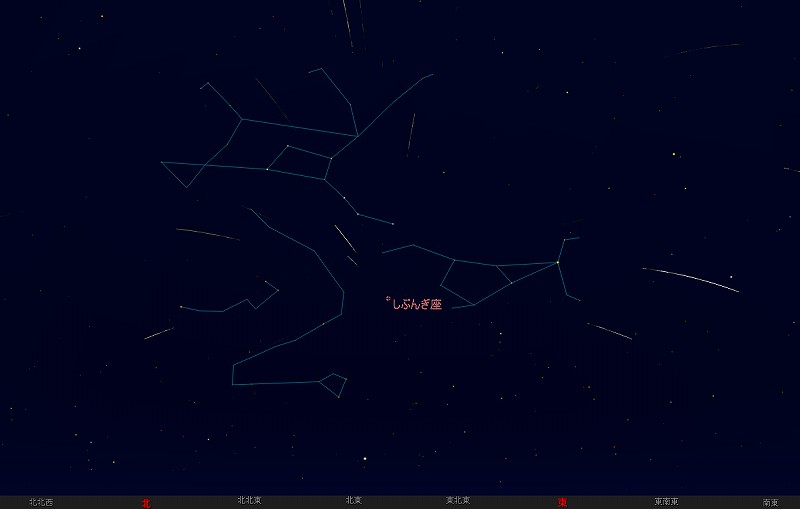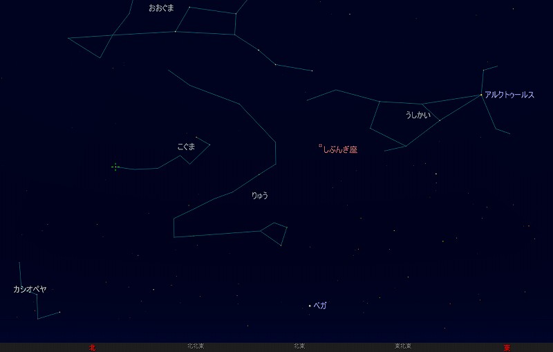 ![]() 2010年1月4日未明4時ごろの北東の空。 しぶんぎ座流星群の放射点は、 北極星と、うしかい座1等星アルクトゥルスの真ん中あたりです。 ![]() 極大予想(4日4時ごろ)があたるといいですね。 月明かりに負けない明るい流星が飛ぶでしょうか。 (図はあくまでもイメージです。) |