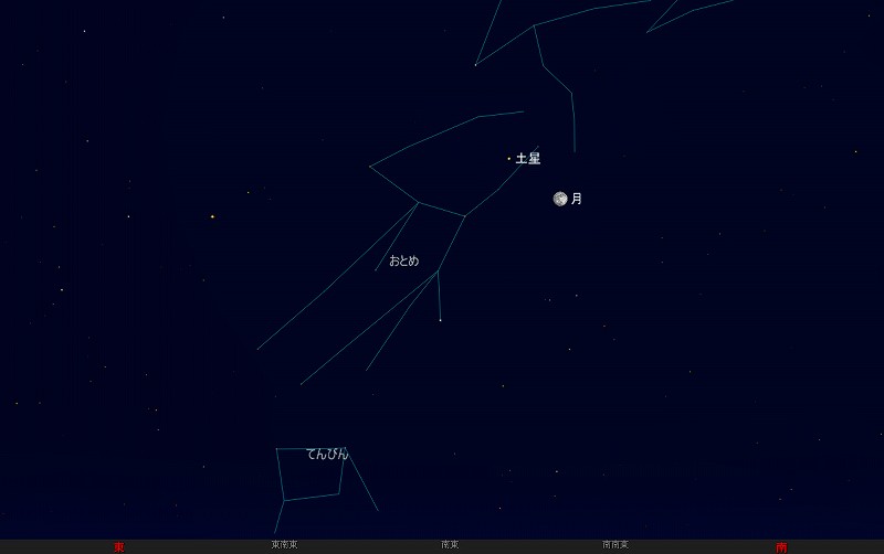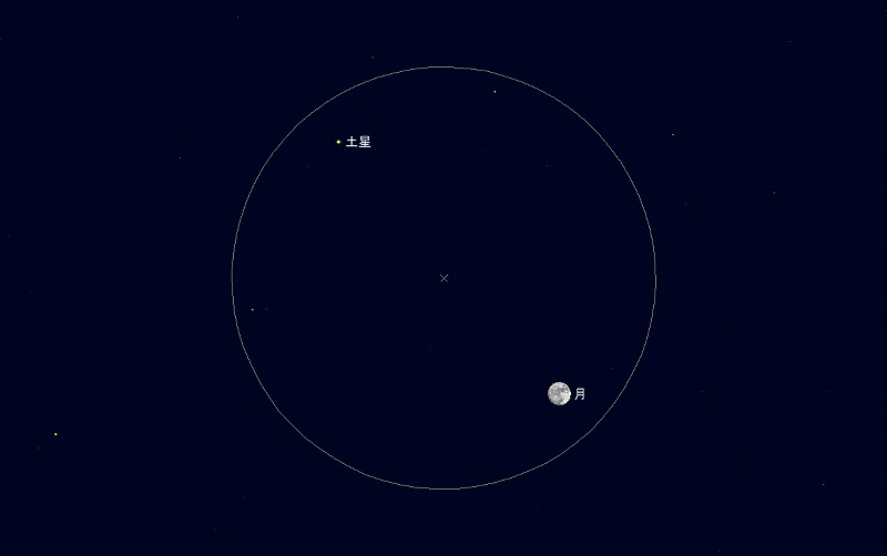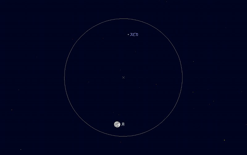 ![]() 2010年3月29日22時ごろの南東の空。 (月齢13.7) ![]() ほぼ満月と土星(視野円10度) ![]() 2010年3月31日22時ごろの南東の空。 (月齢15.7) ![]() ほぼ満月とスピカ (視野円10度) |