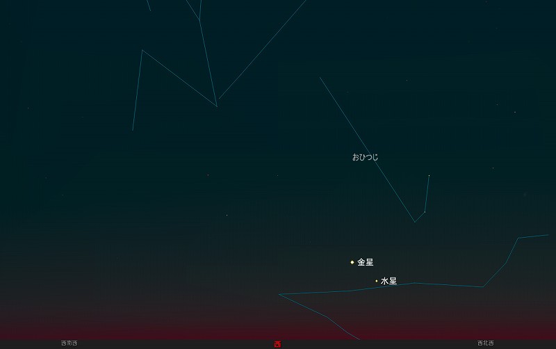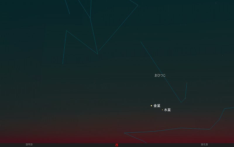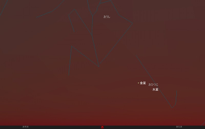 ![]() 2010年3月28日 日没後30分くらいの西の空における 金星と水星の移動の様子。 (時間は以下同じ) ![]() 4月1日 ![]() 4月4日 金星と水星が再接近 ![]() 4月8日 ![]() 4月11日 ![]() ほぼ同時刻の火星の位置。 身体を南に向けて見上げるとあります。ほぼ天頂。 ![]() ほぼ同時刻の土星の位置。 金星、水星から180度後ろを向きましょう。 惑星4つを1度に見るチャンスです! |