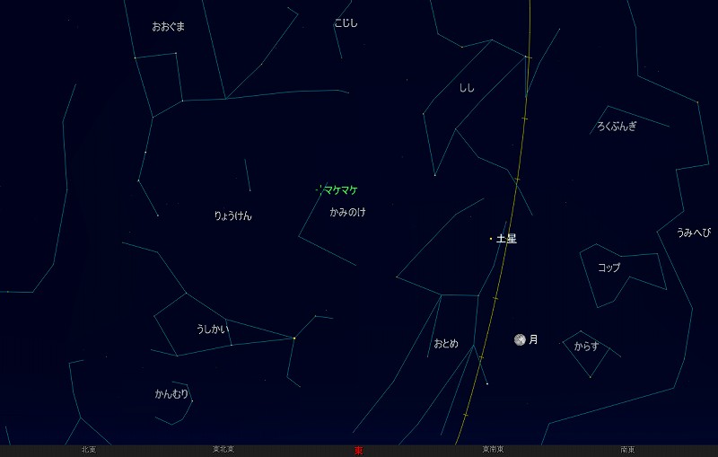 ![]() マケマケの軌道 太陽系を上から。 ![]() マケマケの軌道 太陽系を斜めから。 ![]() マケマケの軌道 太陽系を真横から。 マケマケの軌道傾斜角は29度 ![]() 2010年3月30日20時ごろの東の空。 マケマケが衝。 ![]() マケマケは、かみのけ座にいます。 明るさは16.9等級。 |