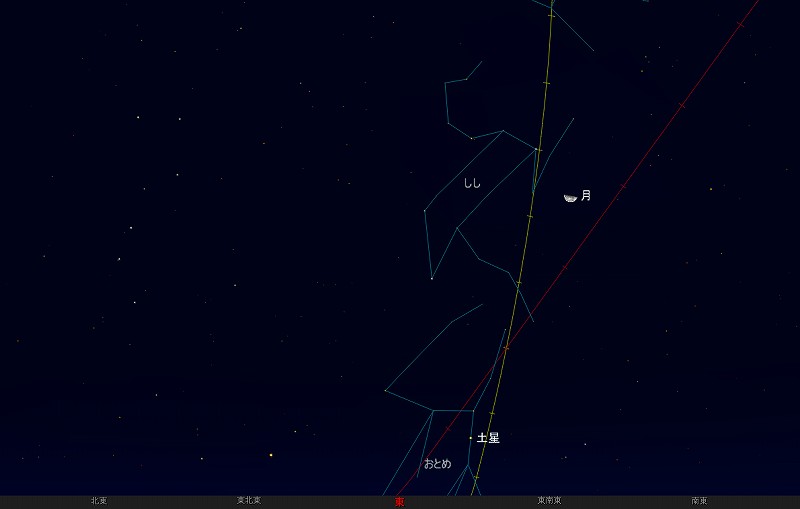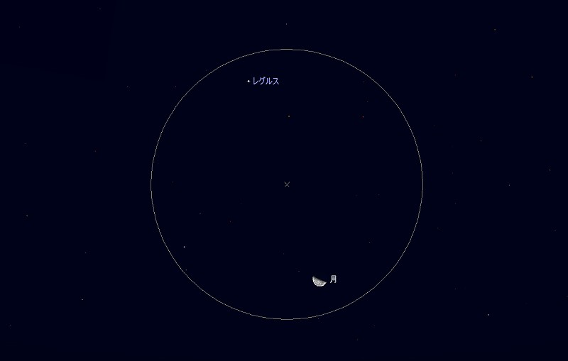 ![]() 2010年11月29日未明3時ごろの東の空。 黄線:黄道、赤線:天の赤道 (月齢22.5) ![]() 下弦の半月とレグルス (視野円10度) |