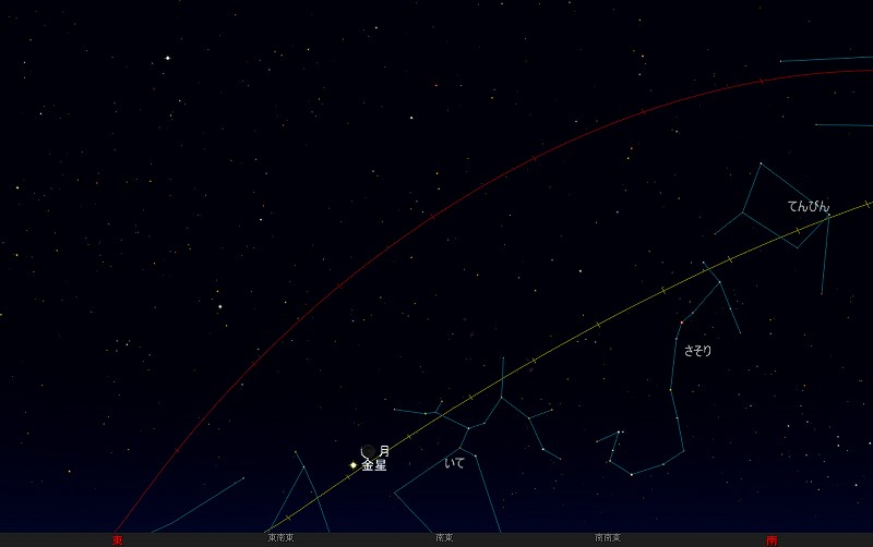 ![]() 2011年3月1日早朝5時ごろの南東の空。 黄線:黄道、赤線:天の赤道 (月齢25.7) ![]() 逆三日月と金星 (視野円7度) |