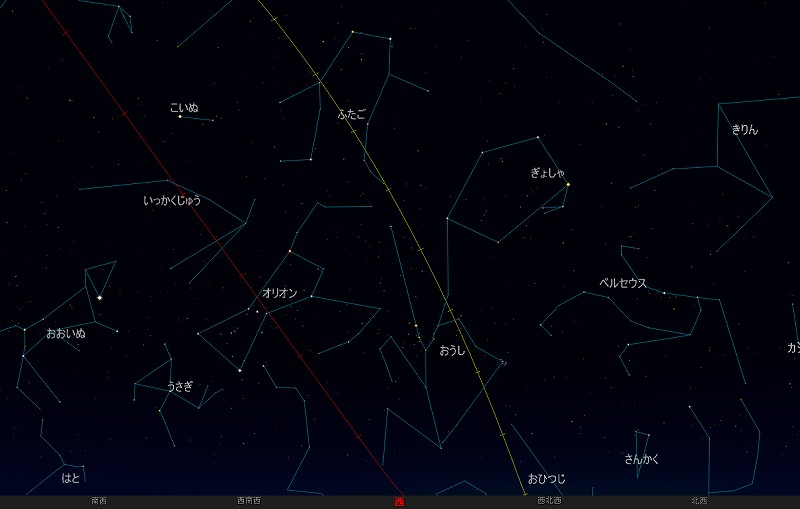 ![]() 2011年4月6日20時ごろの西の空。 黄線:黄道、赤線:天の赤道 (月齢3.6) ![]() 三日月とすばる (視野円7度) |