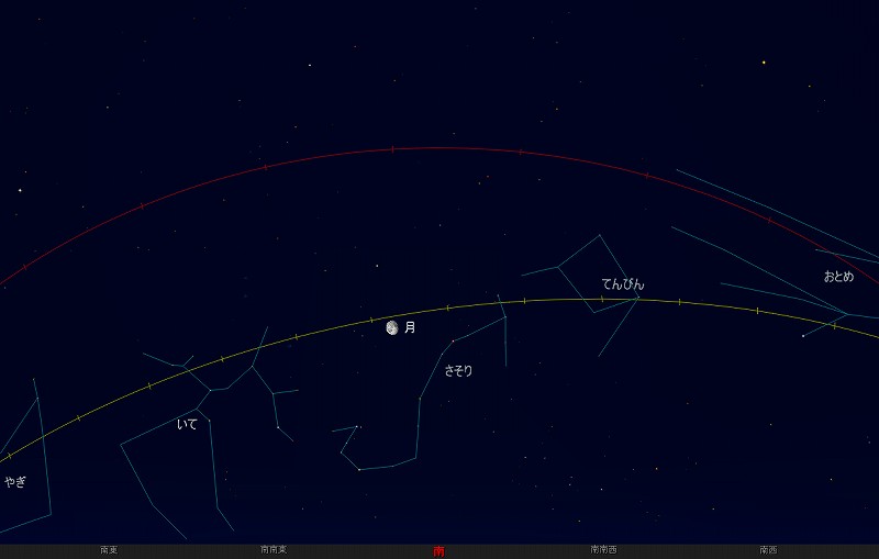 ![]() 2011年4月20日未明3時ごろの南の空。 黄線:黄道、赤線:天の赤道 (月齢16.9) ![]() 月とアンタレス (視野円10度) ![]() 2011年4月21日未明3時ごろの南の空。 黄線:黄道、赤線:天の赤道 (月齢17.9) ![]() 月とアンタレス (視野円10度) |