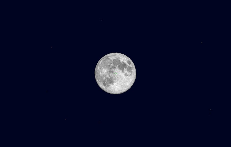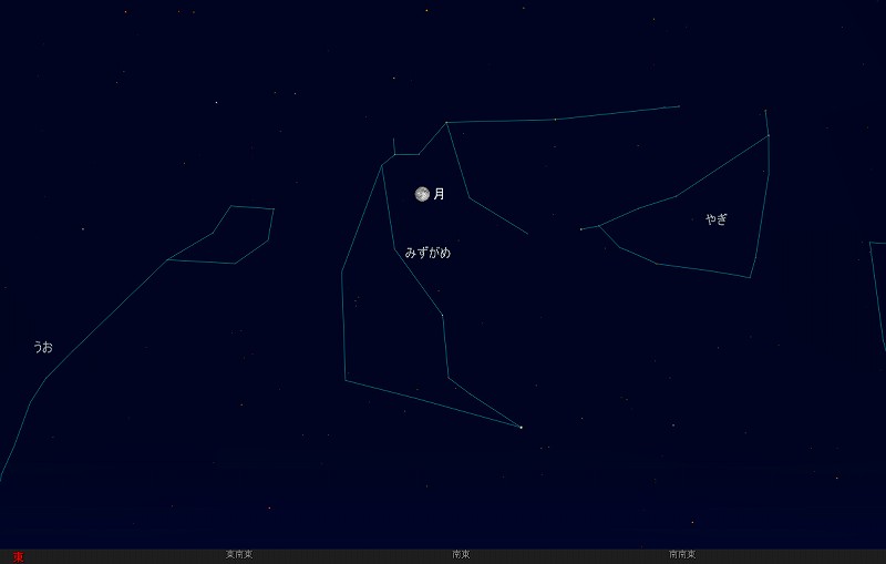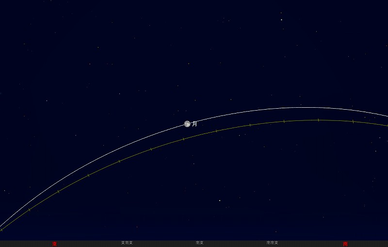 ![]() 2012年8月31日の満月夜。 黄色の線が黄道、 白い線が月の通り道「白道(はくどう)」です。 |