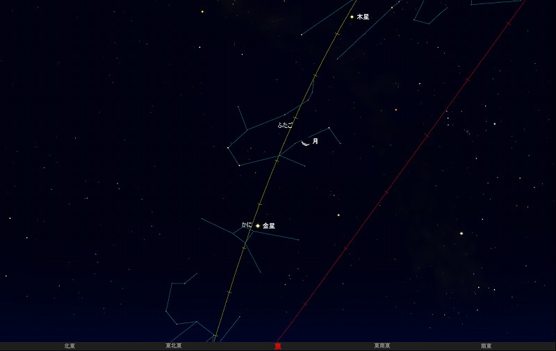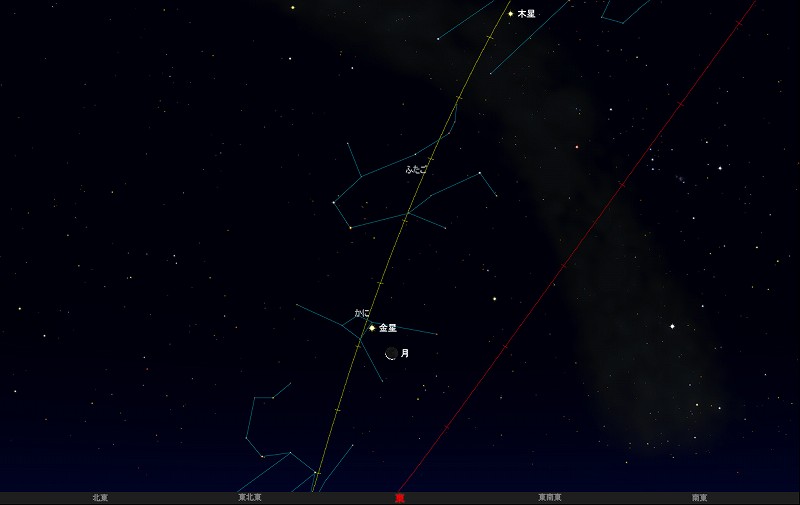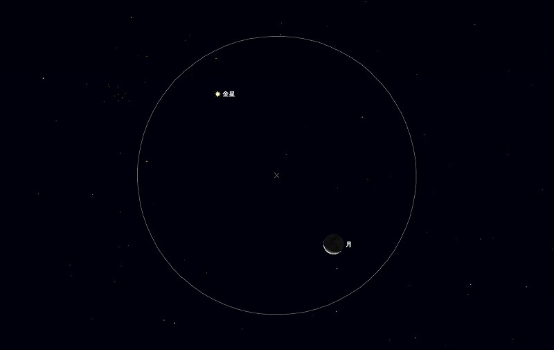 ![]() 2012年9月13日未明4時ごろの東の空。 黄線:黄道、赤線:天の赤道 (月齢26.1) ![]() 新月前の細い月と金星 (視野円7度) |