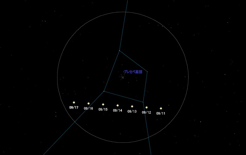 ![]() 2012年9月11日未明4時ごろの東の空。 ![]() 金星が、かに座のプレセペ星団の横を通過していきます。 |