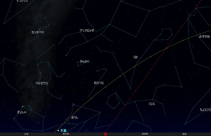 ![]() 2012年10月4日23時ごろの東の空。 黄線:黄道、赤線:天の赤道 (月齢18.5) ![]() 月とすばる (視野円7度) ![]() 2012年10月5日23時ごろの東の空。 黄線:黄道、赤線:天の赤道 (月齢19.5) ![]() 月、木星、アルデバランが集まります (視野円10度) |