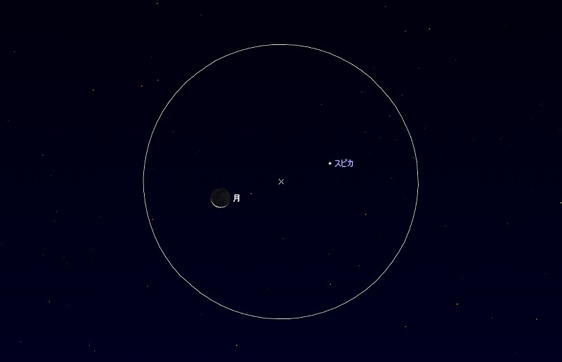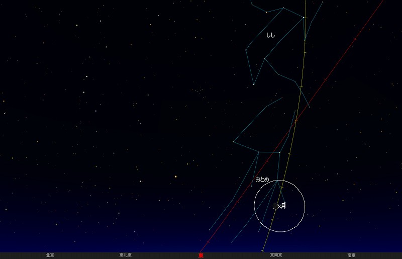 ![]() 2014年11月20日早朝5時時ごろの東の空。 黄線:黄道、赤線:天の赤道 (月齢26.9) ![]() 新月前の細い月とスピカ(おとめ座1等星) (視野円7度) |