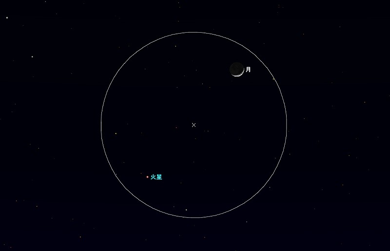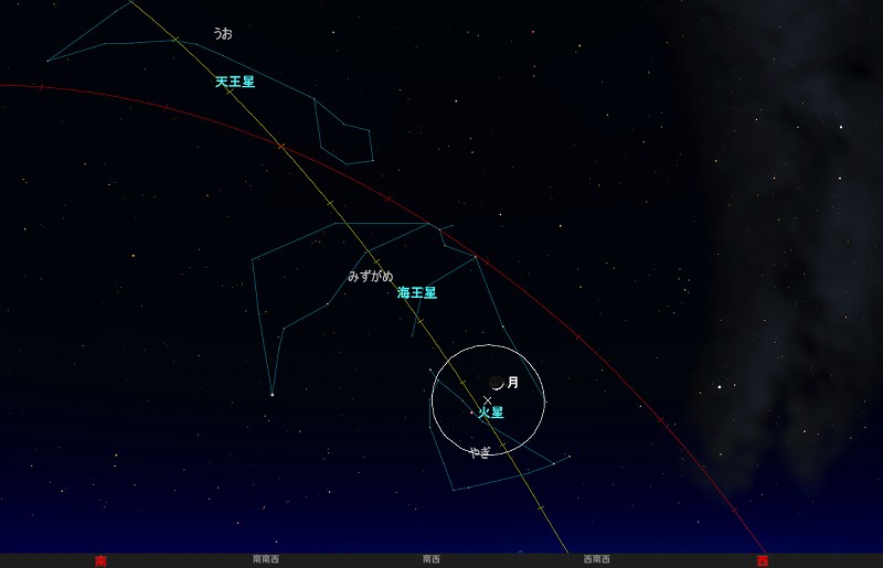 ![]() 2014年12月25日夕方18時ごろの南西の空。 黄線:黄道、赤線:天の赤道 (月齢3.3) ![]() 三日月と火星 (視野円7度) |