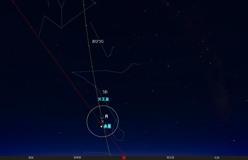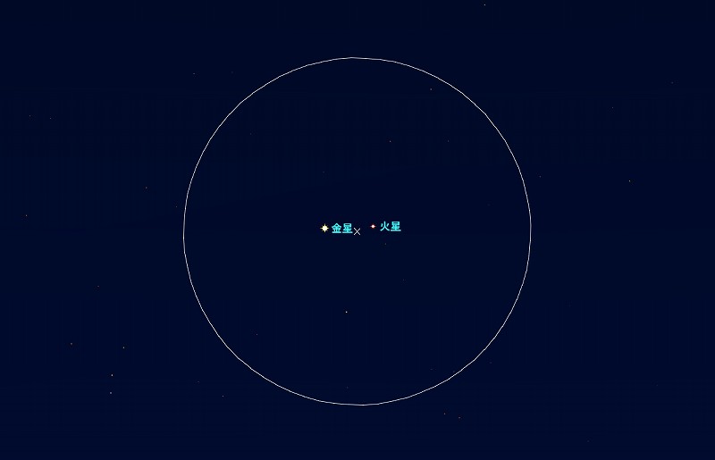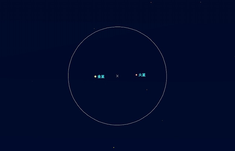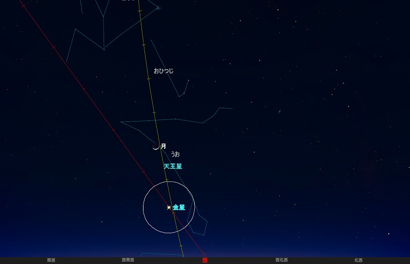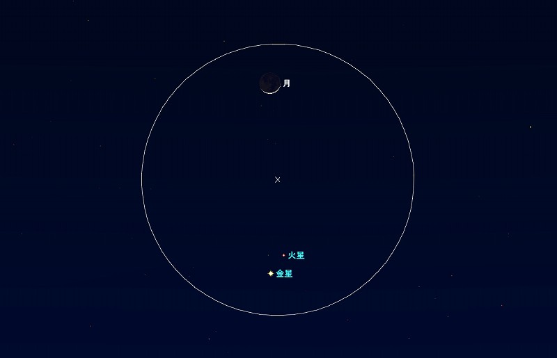 ![]() 2015年2月21日、日没1時間後ごろの西の空。 黄線:黄道、赤線:天の赤道 (月齢2.4) ![]() 細い月、金星、火星が集合 (視野円7度) ![]() 2015年2月22日、日没1時間後ごろの西の空。 黄線:黄道、赤線:天の赤道 (月齢2.4) ![]() 金星と火星が約0.5度まで超接近。 (視野円3度) ![]() 視野円1度 |
