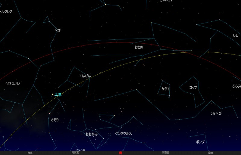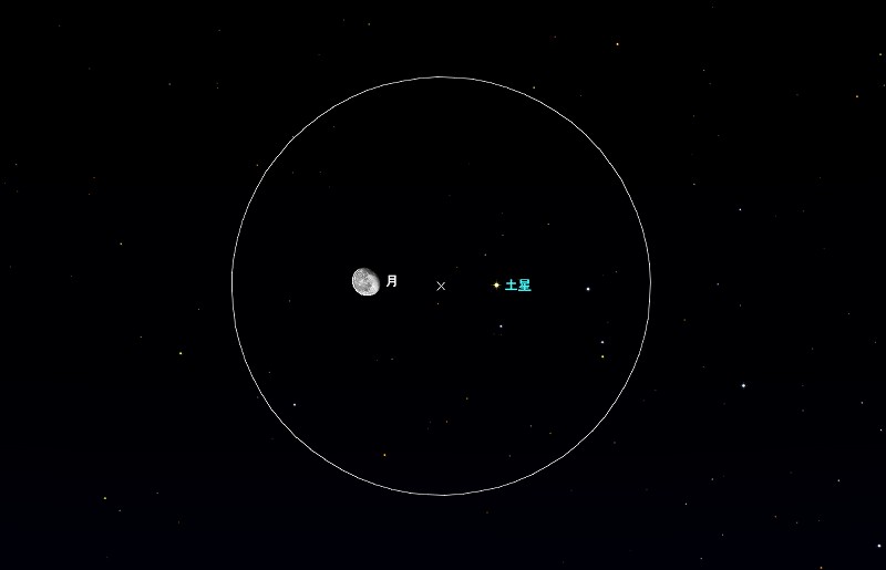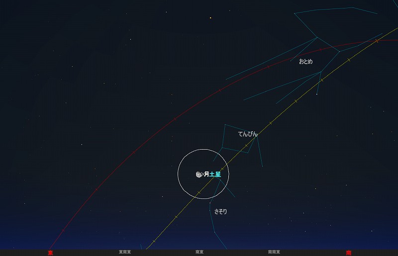 ![]() 2015年4月8日深夜24時(9日0時)ごろの南東の空。 黄線:黄道、赤線:天の赤道 (月齢19.2) ![]() 月と土星 (視野円7度) |