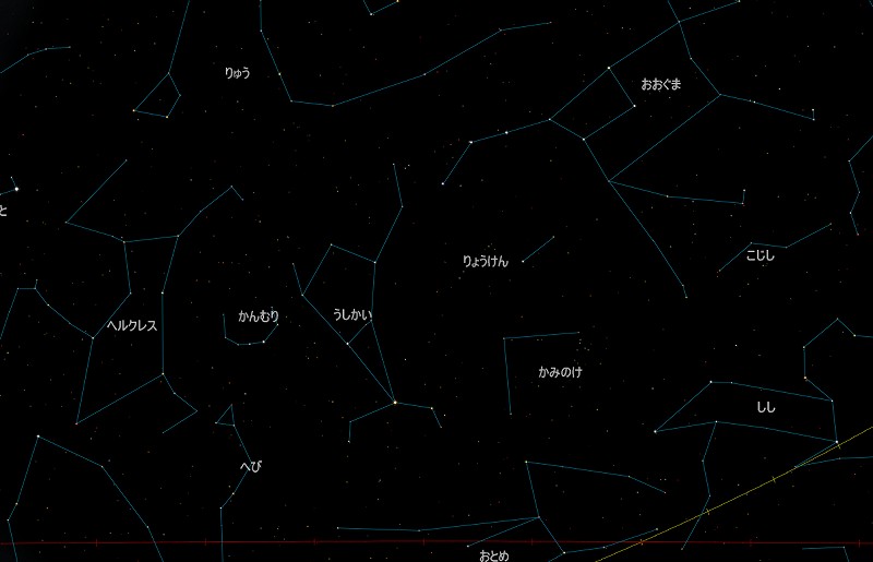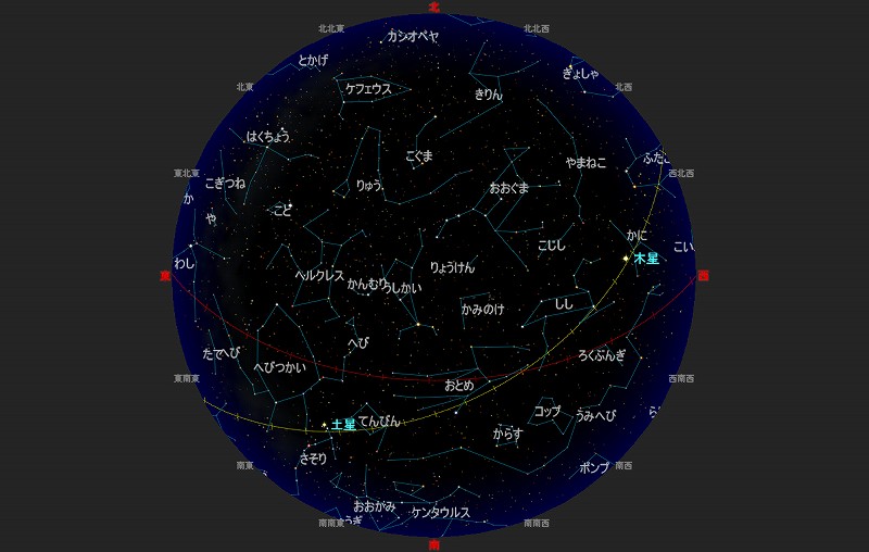 ![]() 2015年4月の星空の様子 (黄線:黄道、赤線:天の赤道) 南の空 上旬21時ごろ 中旬20時ごろ 下旬19時ごろ (以下、同様) ![]() 南〜天頂 ![]() 東の空 ![]() 北の空 ![]() 西の空 ![]() 星座早見 (南が下) ![]() 2015年4月の星空の様子 (黄線:黄道、赤線:天の赤道) 南の空 上旬1時ごろ 中旬0時ごろ 下旬23時ごろ (以下、同様) ![]() 南〜天頂 ![]() 東の空 ![]() 北の空 ![]() 西の空 ![]() 星座早見 (南が下) |