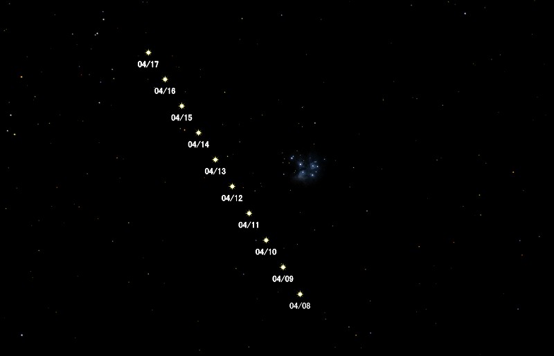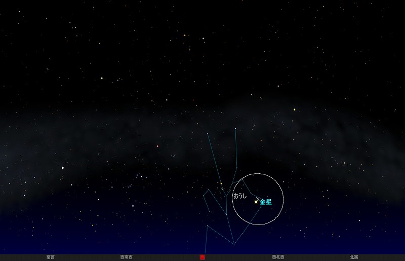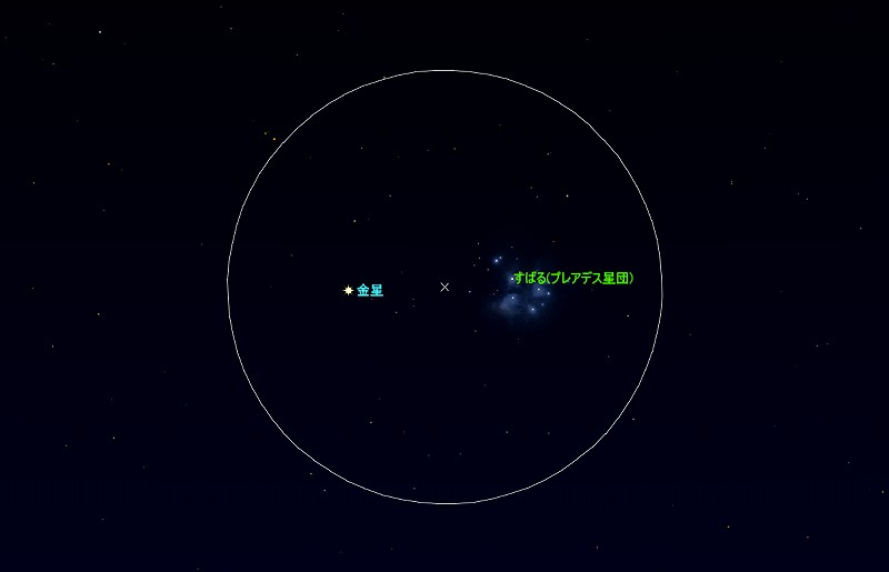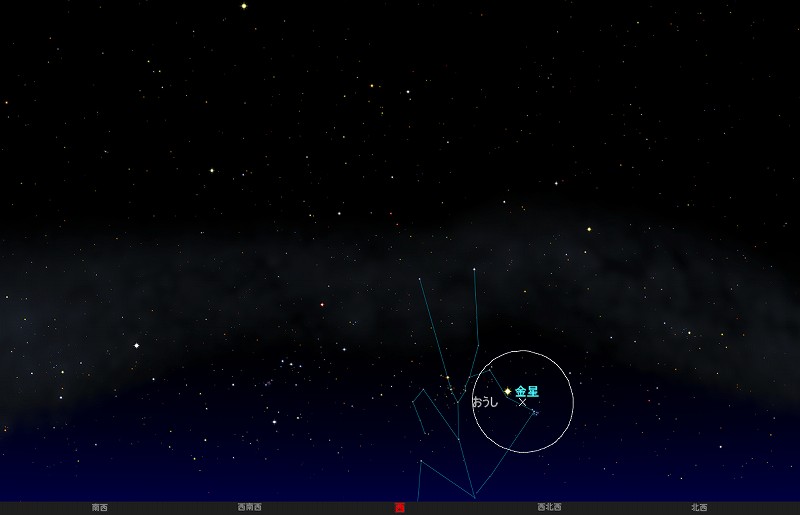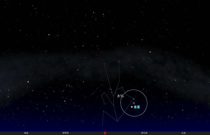![]() 2015年4月8日20時ごろの西の空。 ![]() 金星とすばる(プレアデス星団) 視野円7度 ![]() 2015年4月12日20時ごろの西の空。 ![]() 金星とすばる(プレアデス星団) 視野円7度 ![]() 2015年4月15日20時ごろの西の空。 ![]() 金星とすばる(プレアデス星団) 視野円7度 ![]() 金星の移動の様子 |