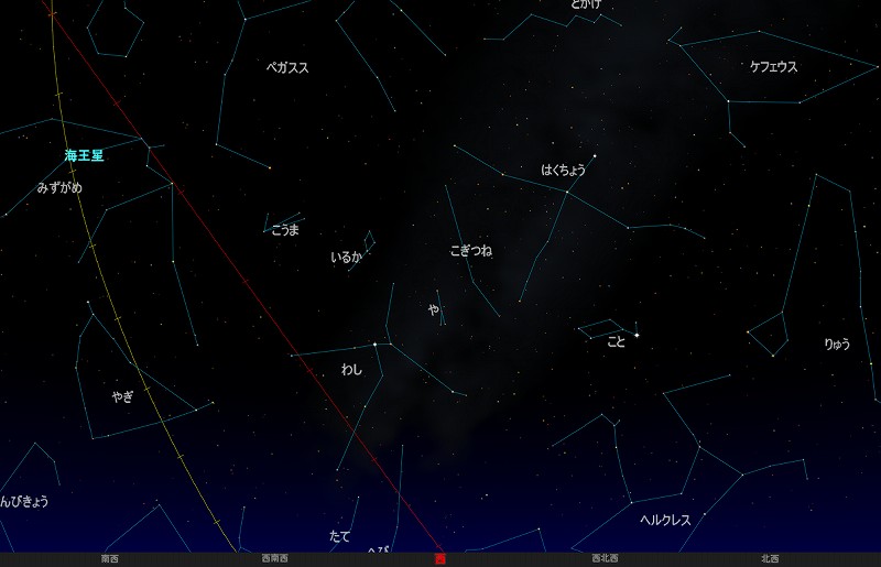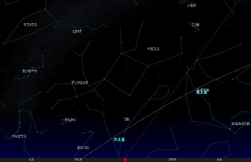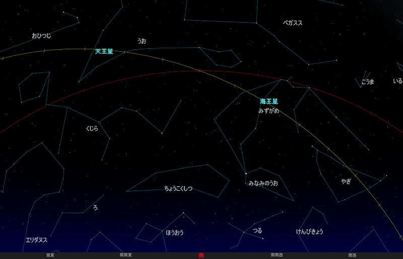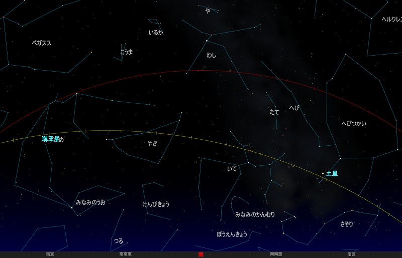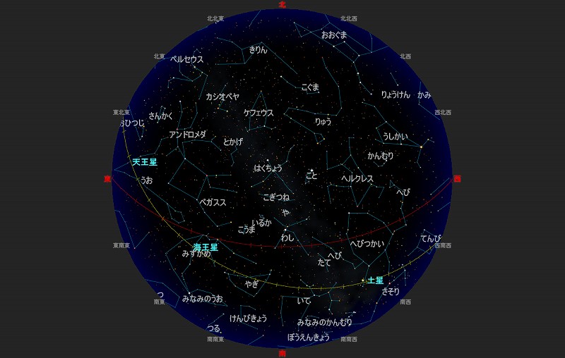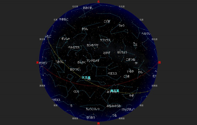 ![]() 2017年9月の星空の様子 (黄線:黄道、赤線:天の赤道) 南の空 上旬21時ごろ 中旬20時ごろ 下旬19時ごろ (以下、同様) ![]() 南〜天頂 ![]() 東の空 ![]() 北の空 ![]() 西の空 ![]() 星座早見 (南が下) ![]() 2017年9月の星空の様子 (黄線:黄道、赤線:天の赤道) 南の空 上旬1時ごろ 中旬0時ごろ 下旬23時ごろ (以下、同様) ![]() 南〜天頂 ![]() 東の空 ![]() 北の空 ![]() 西の空 ![]() 星座早見 (南が下) |