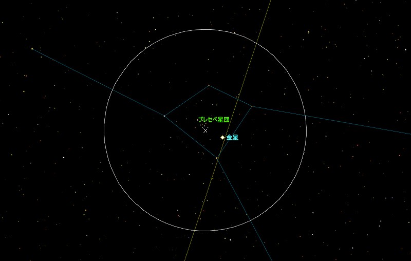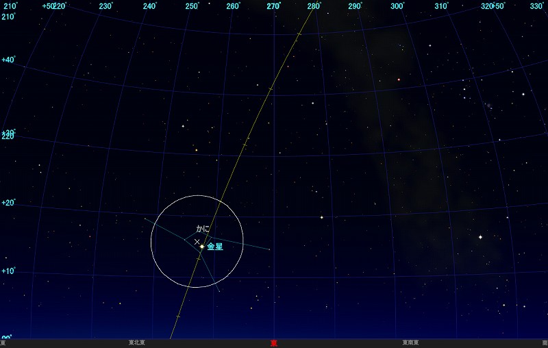![]() 2017年9月2日、日の出1時間前の東の空。 金星がプレセペ星団に接近。 ![]() 黄線が黄道 (視野円10度) ![]() 金星の移動の様子。 黄線が黄道。 (視野円10度) |