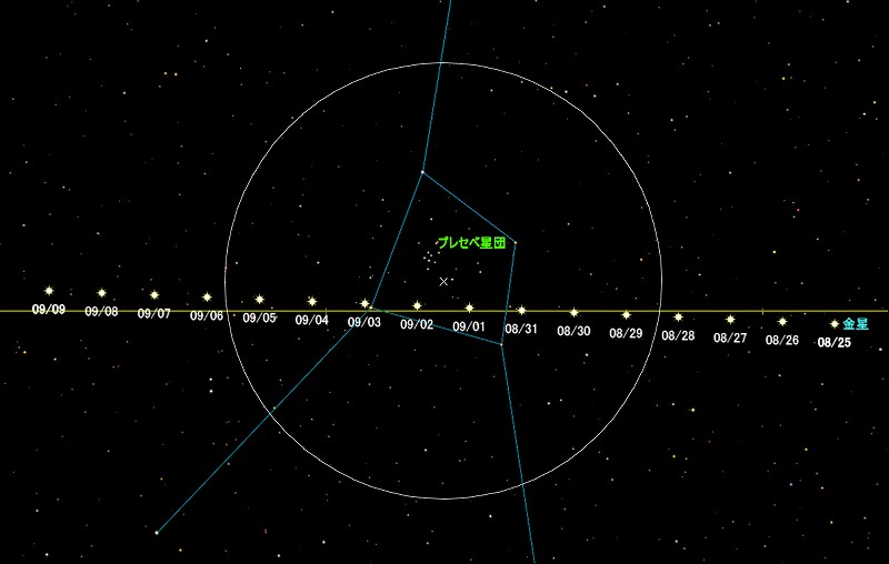 | ★彡〜☆彡〜★彡〜☆彡〜★彡〜☆彡〜★彡〜☆彡〜★彡〜☆彡〜★彡〜☆彡 今宵はどんな星空が見えるでしょう。。。 ☆彡 流 れ 星 か ら の 贈 り 物 ★彡 第619号 2017年9月4日発行 ☆彡〜★彡〜☆彡〜★彡〜☆彡〜★彡〜☆彡〜★彡〜☆彡〜★彡〜☆彡〜★彡 こんにちは。 「流れ星」の鈴木です。 ご愛読いただいている皆さま、 新しく読者登録していただいた方、 本当にありがとうございます。 それでは、今週もよろしくお願いします☆彡 ★彡〜☆彡〜★彡〜☆彡〜★彡〜☆彡〜★彡〜☆彡〜★彡〜☆彡〜★彡〜☆彡 ★今週の話題 ☆彡〜★彡〜☆彡〜★彡〜☆彡〜★彡〜☆彡〜★彡〜☆彡〜★彡〜☆彡〜★彡 ★1.長月9月の主な天文現象 ★2.金星がプレセペ星団の近くを通過(9月上旬) ★3.国際宇宙ステーションを見よう! ★4.編集後記 ★彡〜☆彡〜★彡〜☆彡〜★彡〜☆彡〜★彡〜☆彡〜★彡〜☆彡〜★彡〜☆彡 ★1.長月9月の主な天文現象 ☆彡〜★彡〜☆彡〜★彡〜☆彡〜★彡〜☆彡〜★彡〜☆彡〜★彡〜☆彡〜★彡 今年は特に東日本では、 比較的過ごしやすい夏でした。 残暑も目途がたち、 晴れ間に見えるすじ雲が、 秋を予感させます。 太陽が沈むと、 東の空にはペガススの四辺形が 昇っています。 それでは、9月の天文現象をチェックしてみましょう。 ★ 2日 金星がプレセペ星団の近くを通過 ★ 5日 海王星がみずがめ座で衝 ( 6日 月が満月 16時3分) ★12日 水星が西方最大離角 ★13日 月とアルデバランが並ぶ(未明) (13日 月が下弦 15時25分) ★17日 火星と水星が超超接近(早朝) ★18日 細い月と金星が超接近(早朝) ★19日 南日本 新月前の細い月が水星を隠す(早朝) ★20日 金星とレグルスが超超接近(早朝) (20日 月が新月 14時30分) ★22日 新月後の細い月と木星が並ぶ(日没直後) ★23日 秋分 ★27日 月と土星が並ぶ (28日 月が上弦 11時54分) なかごろに、 早朝の東の空で超超接近祭りが開催です。 ただし、いずれも日の出直前で タイミングが難しいです。 9月の星空の様子はコチラ。 http://nagarebosi-kirari.com/mailmaga2/20170904.html#01 【関連トピック】 手の平で星座を掴まえよう 夏編 http://nagarebosi-kirari.com/mailmaga/20060814.html 手の平で星座を掴まえよう 秋編 http://nagarebosi-kirari.com/mailmaga/20071022.html 夏秋の1等星くらべっこ http://nagarebosi-kirari.com/mailmaga/20110815.html さそりの赤い火 アンタレス http://nagarebosi-kirari.com/mailmaga/20120625.html 天の川で出会う二人の白鷲(ベガとアルタイル) http://nagarebosi-kirari.com/mailmaga/20070702.html 天にかかる大きな川 天の川 http://nagarebosi-kirari.com/mailmaga/20060703.html 天空に浮かぶ北十字 そして、デネブ、アルビレオ http://nagarebosi-kirari.com/mailmaga/20120820.html ひっそり佇む秋のひとつ星 フォーマルハウト http://nagarebosi-kirari.com/mailmaga/20060925.html 半人半馬の賢者ケイロン(いて座) http://nagarebosi-kirari.com/mailmaga/20070723.html パンパカパーン!こんなヤギになっちゃった(やぎ座) http://nagarebosi-kirari.com/mailmaga/20080915.html 永遠の美少年 健気なガニュメデス(みずがめ座) http://nagarebosi-kirari.com/mailmaga/20071008.html ウオ!とビックリ 魚となって。。。(うお座) http://nagarebosi-kirari.com/mailmaga/20061204.html 数奇な英雄ヘラクレス(ヘルクレス座) http://nagarebosi-kirari.com/mailmaga/20080623.html ヘビをまとう名医アスクレピオス(へびつかい座・へび座) http://nagarebosi-kirari.com/mailmaga/20100628.html 夏の夜に響く琴の音色(こと座) http://nagarebosi-kirari.com/mailmaga/20070813.html 天空を舞うゼウスの化身(はくちょう座、わし座) http://nagarebosi-kirari.com/mailmaga/20060731.html その鷲はワシだ(わし座) http://nagarebosi-kirari.com/mailmaga/20110822.html 秋といえば…四辺形?五角形?(ケフェウス座) http://nagarebosi-kirari.com/mailmaga/20061016.html 酔いどれ気分でウォゥウォウオ(みなみのうお座) http://nagarebosi-kirari.com/mailmaga/20081013.html 岩からうまれた天馬(ペガスス座) http://nagarebosi-kirari.com/mailmaga/20101025.html たて、たつんだ!(たて座) http://nagarebosi-kirari.com/mailmaga/20100726.html コギツネかすめるエロスの矢(こぎつね座、や座) http://nagarebosi-kirari.com/mailmaga/20080721.html イルカに乗ったアリオン(いるか座) http://nagarebosi-kirari.com/mailmaga/20090824.html ♪おうまのきょうだい なかよしこよし(こうま座) http://nagarebosi-kirari.com/mailmaga/20090914.html 南天をまわり続ける3羽の鳥 (きょしちょう座、くじゃく座、ふうちょう座) http://nagarebosi-kirari.com/mailmaga2/20170828.html 夜空にへばりつくトカゲ(とかげ座) http://nagarebosi-kirari.com/mailmaga/20070903.html 宇宙は顕微鏡でもみえるのさ (けんびきょう座、ぼうえんきょう座) http://nagarebosi-kirari.com/mailmaga/20100906.html 南天のインディアン(インディアン座) http://nagarebosi-kirari.com/mailmaga2/20130909.html 天ひびくツルの一声(つる座) http://nagarebosi-kirari.com/mailmaga/20100927.html ★彡〜☆彡〜★彡〜☆彡〜★彡〜☆彡〜★彡〜☆彡〜★彡〜☆彡〜★彡〜☆彡 ★2.金星がプレセペ星団の近くを通過(9月上旬) ☆彡〜★彡〜☆彡〜★彡〜☆彡〜★彡〜☆彡〜★彡〜☆彡〜★彡〜☆彡〜★彡 かに座のプレセペ星団は、 太陽の通り道である黄道に接しているため、 時折