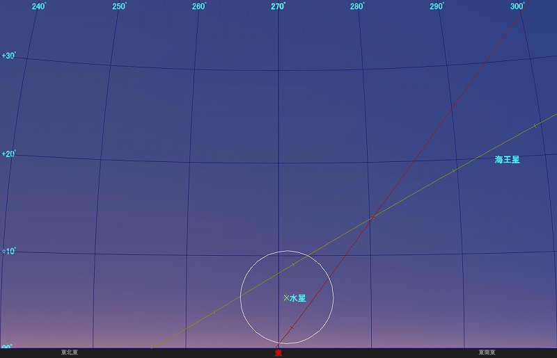 ![]() 2018年4月30日、日の出30分前の東の空。 水星が西方最大離角。 なんですけど、 地平線に対して黄道が傾いているので、 水星の高度があまりありません。 |