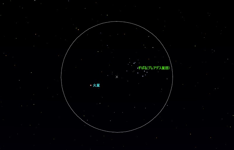 ![]() 2019年3月31日20時ごろの西の空。 ![]() 火星とプレアデス星団=すばる (視野円7度) |