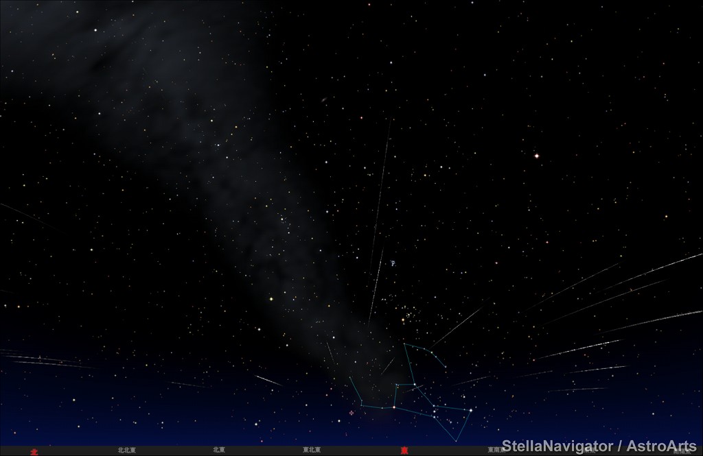 ![]() 2020年10月21日22時ごろの東の空。 オリオン座流星群が極大か。 ピンク色の十字が放射点(流星が飛ぶ中心点)。 ![]() 10月21日深夜25時(22日1時)ごろの東の空。 ![]() 2020年の極大予想は 21日15時ごろです。 月齢4.6の月は21時ごろ沈みます。 (図はシミュレーションです。) |