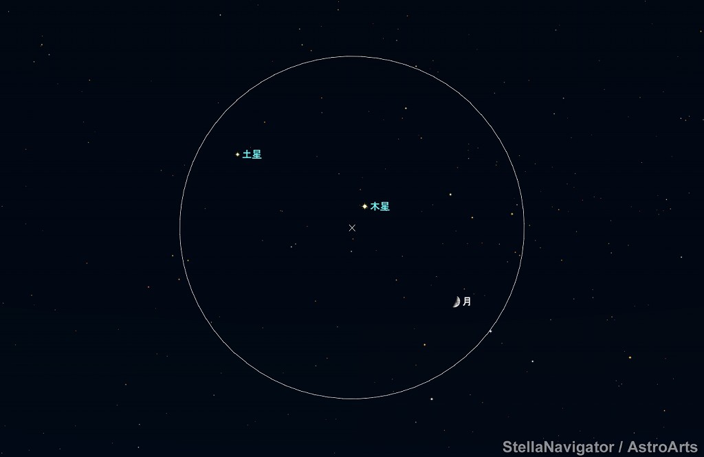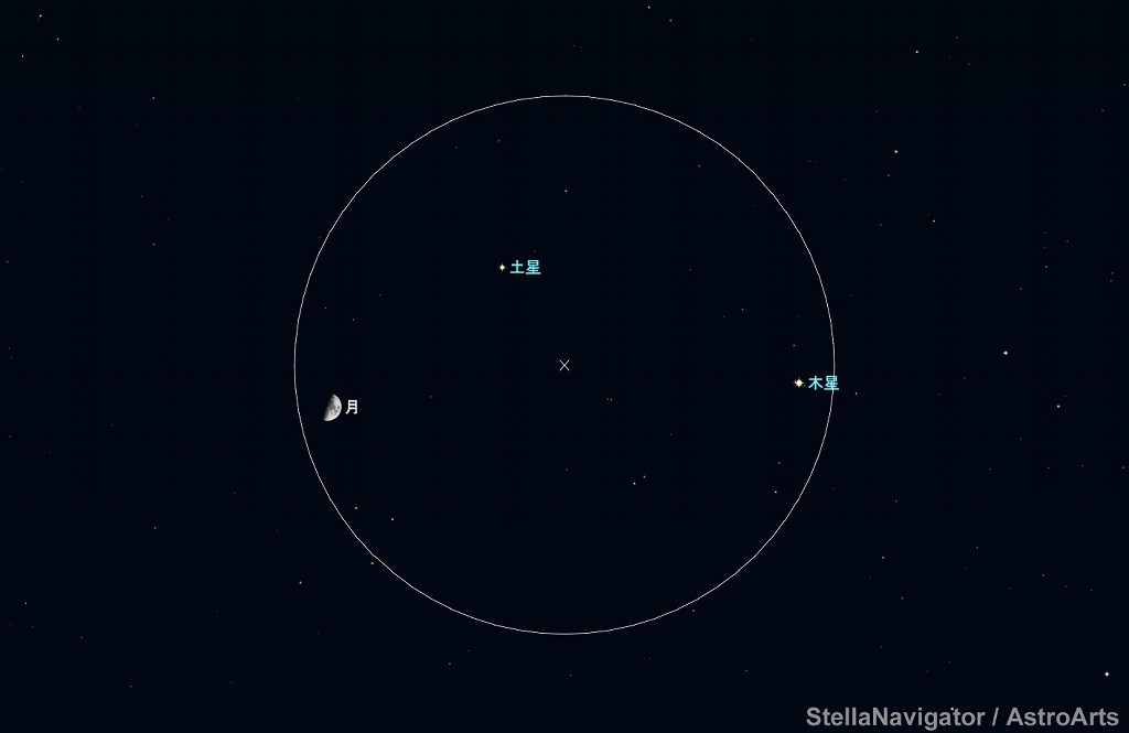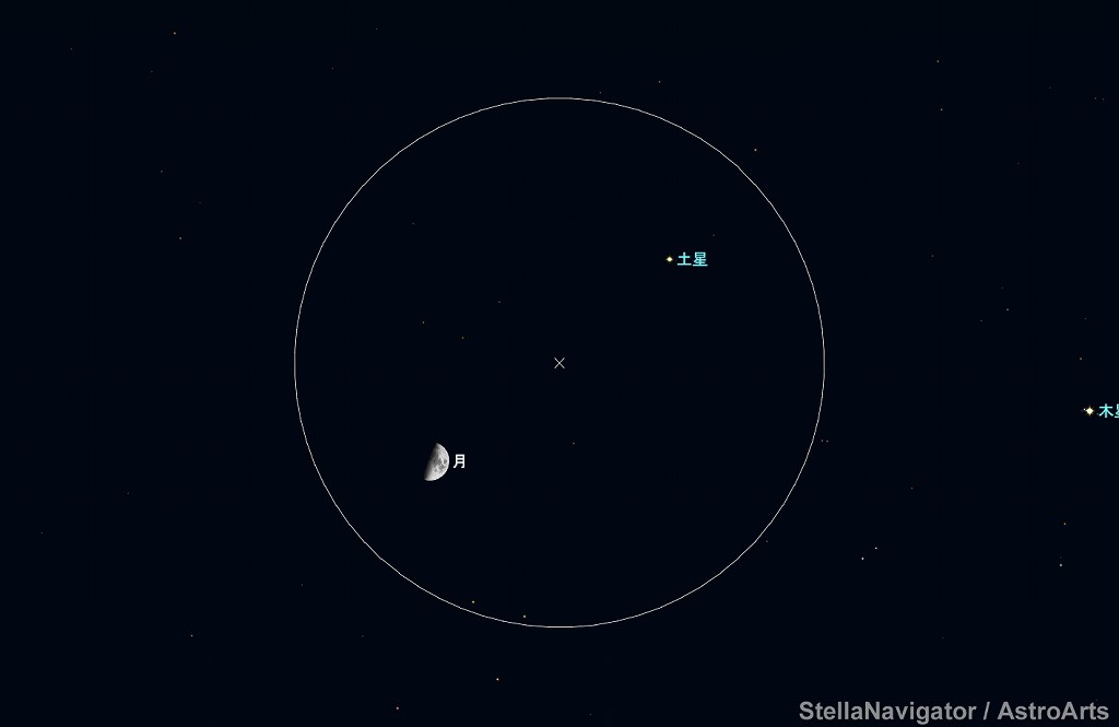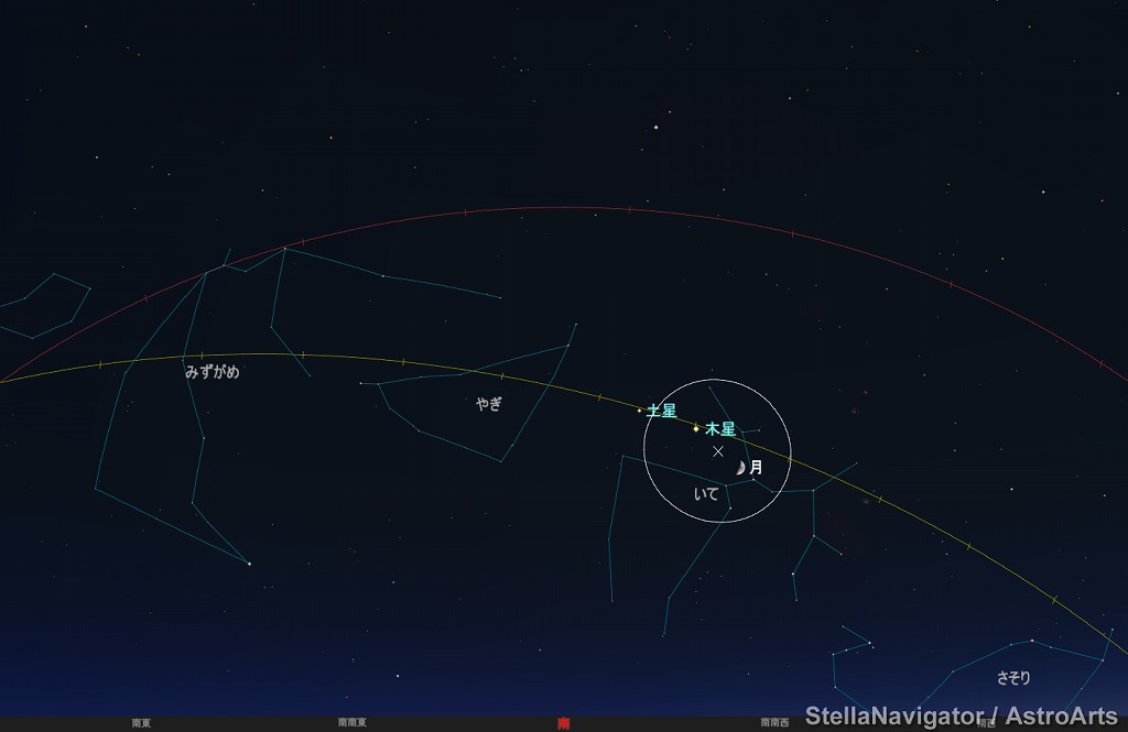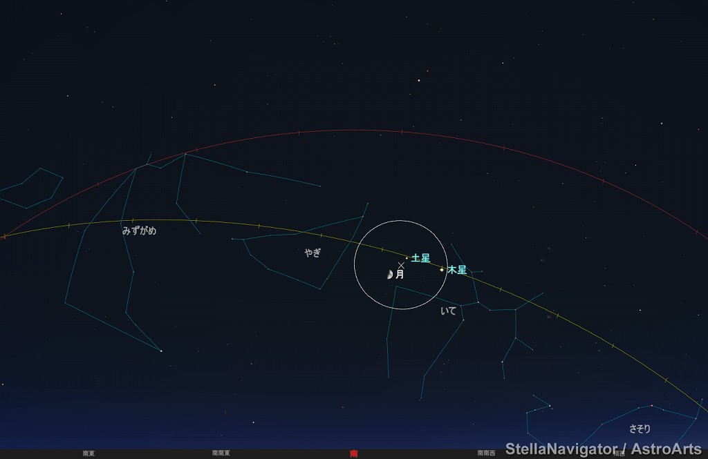 ![]() 2020年10月22日18時ごろの南の空。 黄線:黄道、赤線:天の赤道 (月齢5.6) ![]() 月と木星 (視野円7度) ![]() 月、木星、土星 (視野円15度) ![]() 2020年10月23日18時ごろの南の空。 黄線:黄道、赤線:天の赤道 (月齢6.6) ![]() 上弦の半月と土星 (視野円7度) ![]() 月、土星、木星 (視野円10度) |