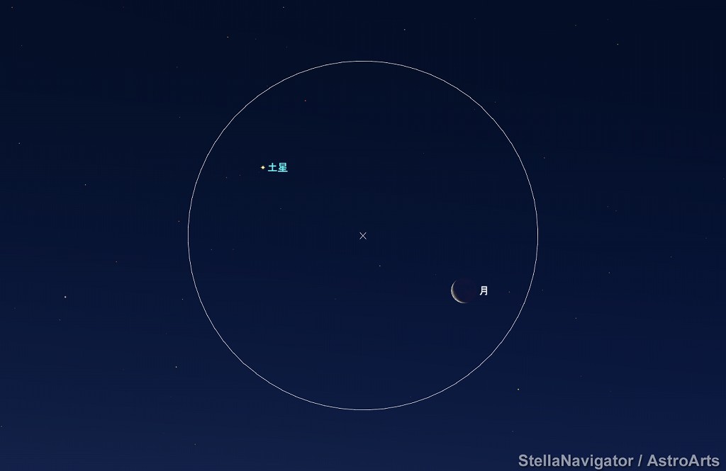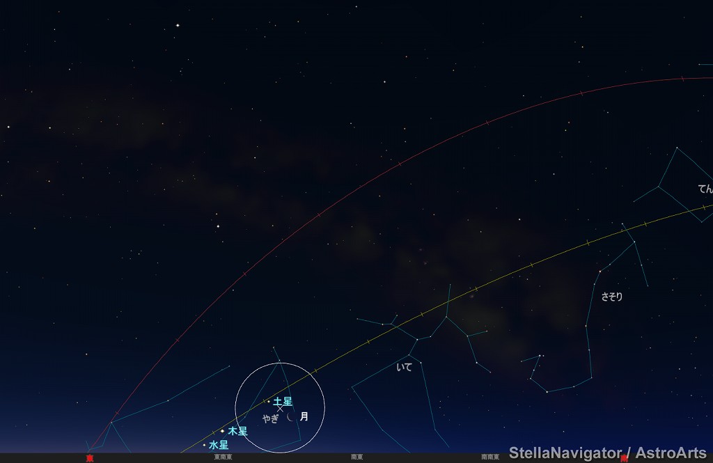 ![]() 2021年3月10日早朝5時ごろの南東の空。 黄線:黄道、赤線:天の赤道 (月齢26.0) ![]() 逆三日月と土星 (視野円7度) |