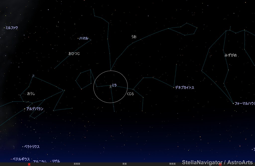 ![]() 2021年8月下旬、深夜1時ごろの南東の空。 くじら座ミラが極大。2等級。 ![]() 【ミラの変光の様子】 2021年9月上旬 2.0等級 ![]() 2021年11月上旬 4.0等級 ![]() 2022年1月上旬 7.6等級 ![]() 2022年3月上旬 9.9等級 |