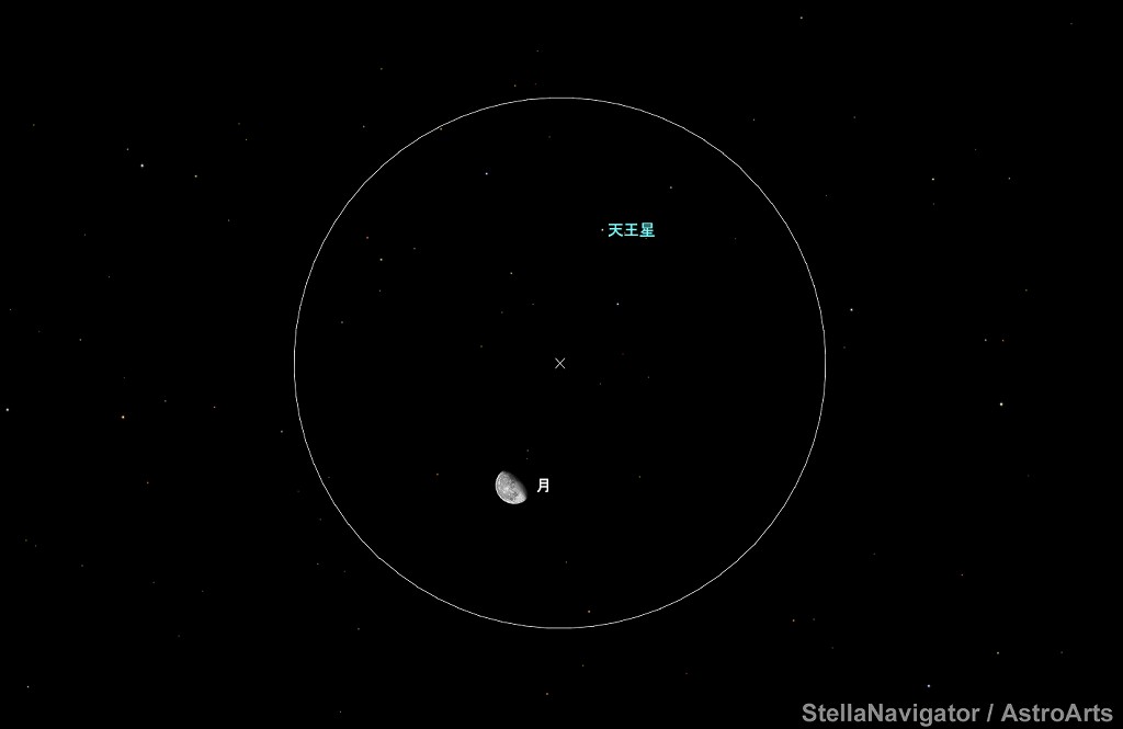 ![]() 2021年8月28日24時ごろの東の空。 黄線:黄道、赤線:天の赤道 (月齢20.0) ![]() 月と天王星(5.7等級) (視野円7度) |