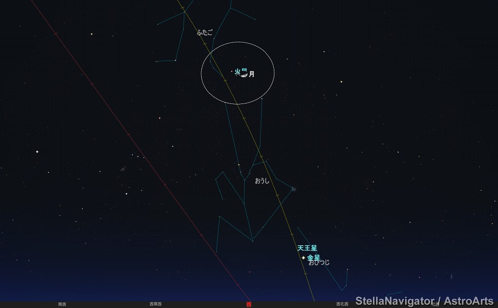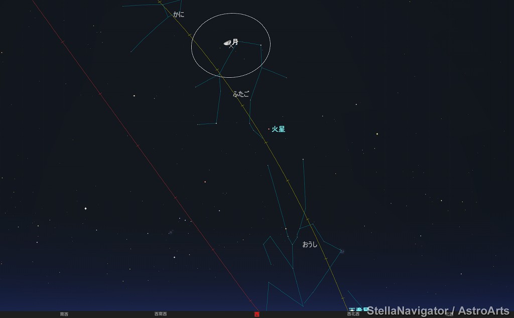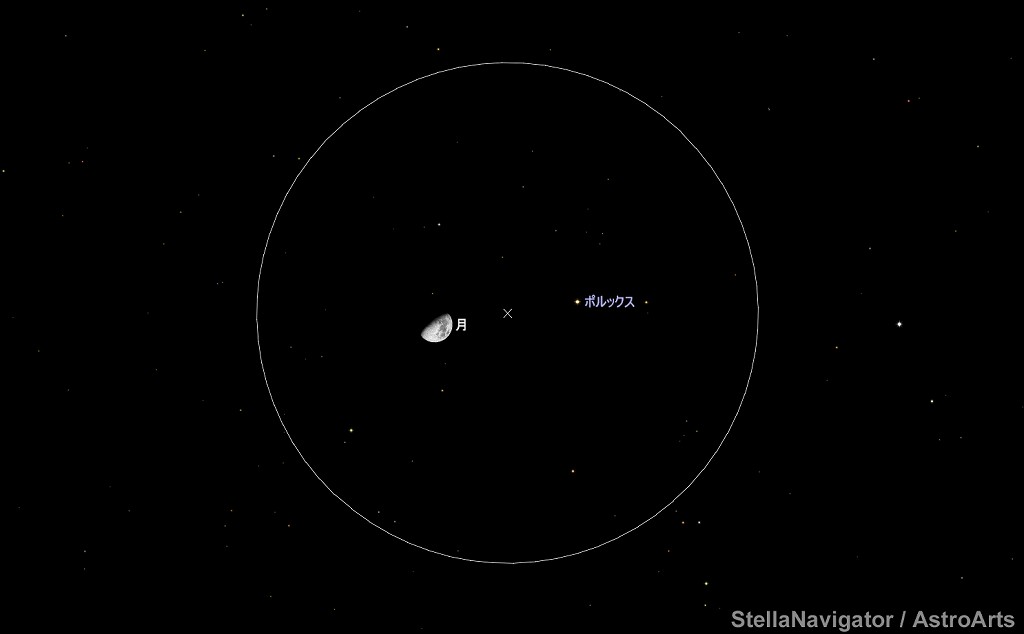 ![]() 2023年3月28日20時ごろの西の空。 黄線:黄道、赤線:天の赤道 (月齢6.7) ![]() 月と火星 (視野円7度) ![]() 2023年3月30日21時ごろの西の空。 黄線:黄道、赤線:天の赤道 (月齢8.8) ![]() 月とポルックス (視野円7度) ![]() 2023年4月2日21時ごろの南の空。 黄線:黄道、赤線:天の赤道 (月齢11.8) ![]() 月と火星 (視野円7度) |