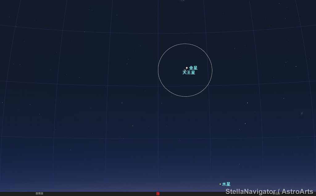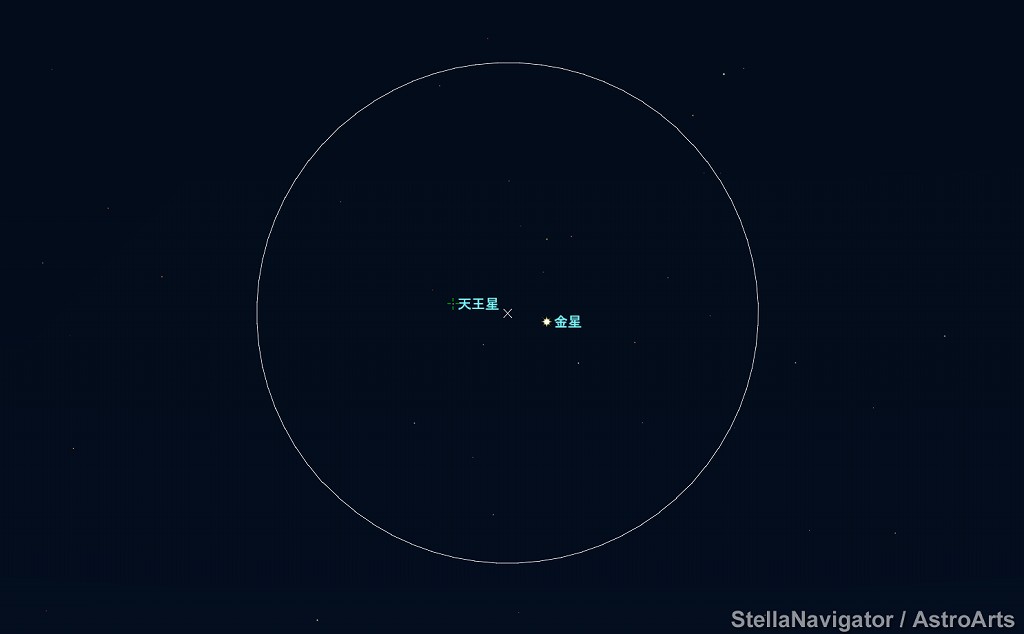 ![]() 2023年3月30日19時ごろの西の空。 金星と天王星が超接近。 ![]() 金星(−4等級)と天王星(5.8等級)は 1度強まで接近。 (視野円7度) ![]() 2023年3月31日19時ごろの西の空。 金星と天王星が超接近。 ![]() 31日も金星と天王星は 1度強まで接近します。 (視野円7度) |