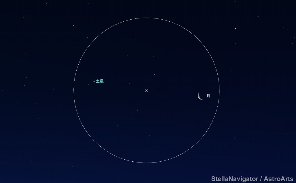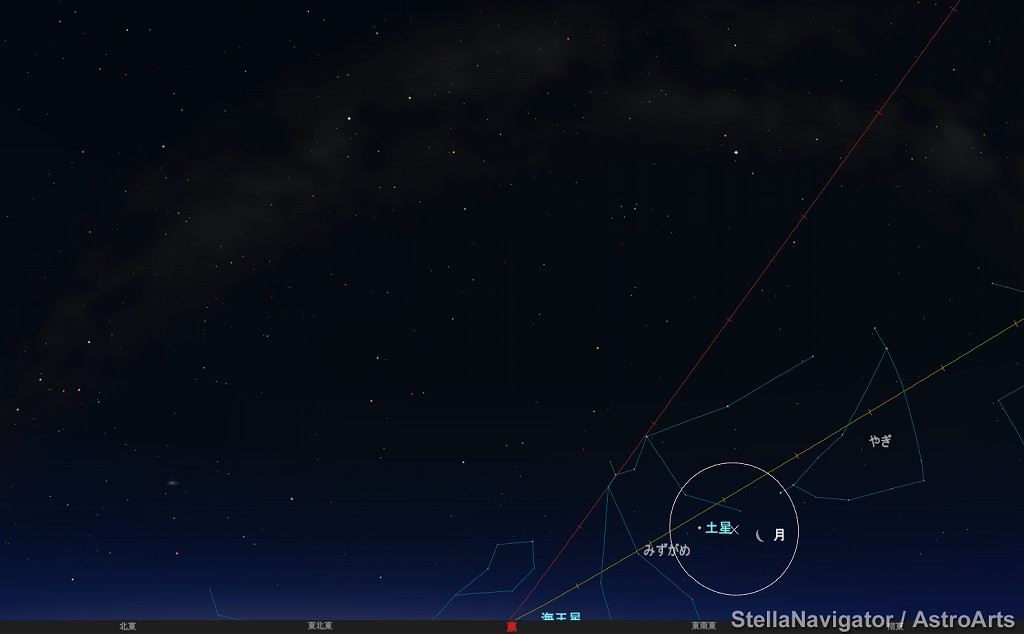 ![]() 2023年4月11日未明3時ごろの南の空。 黄線:黄道、赤線:天の赤道 (月齢20.0) ![]() 月とアンタレス (視野円10度) ![]() 2023年4月16日早朝4時ごろの東の空。 黄線:黄道、赤線:天の赤道 (月齢25.1) ![]() 逆三日月と土星 (視野円10度) |