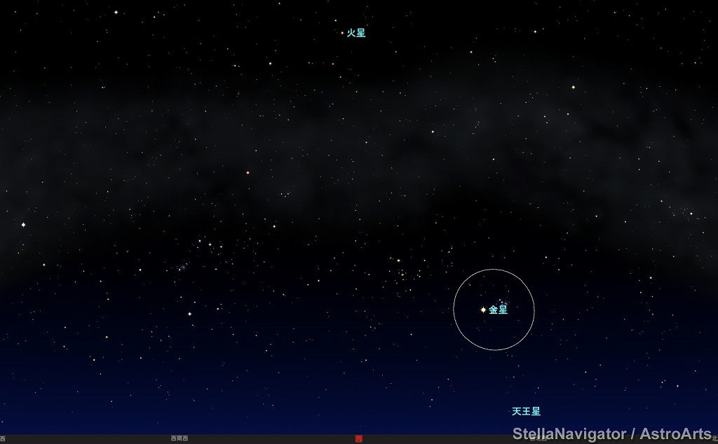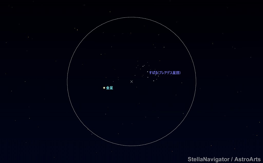 ![]() 2023年4月11日20時ごろの西の空。 ![]() 金星(宵の明星)とプレアデス星団(すばる) (視野円7度) |