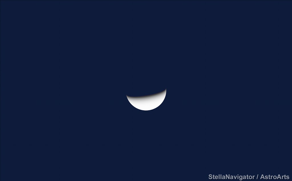 ![]() 2023年412日、日没1時間後ごろの西の空。 水星が東方最大離角。 水星の高さは約7度。 ![]() 望遠鏡で見ると、 上弦の半月の前のような姿に見えます。 |