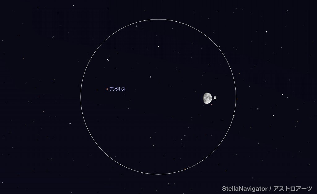 ![]() 2024年7月17日21時ごろの南の空。 黄線:黄道、赤線:天の赤道 (月齢11.5) ![]() 月とアンタレス (視野円7度) |