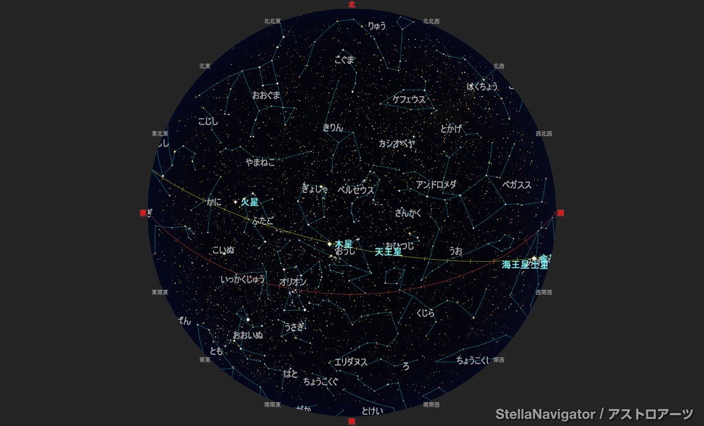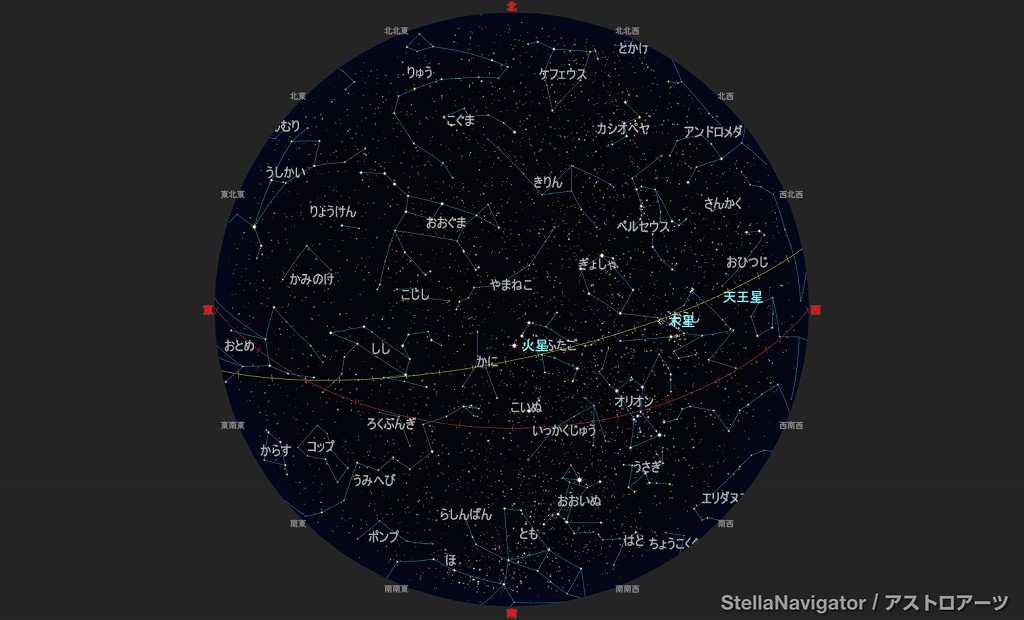 ![]() 2025年1月の星空の様子 (黄線:黄道、赤線:天の赤道) 南の空 上旬21時ごろ 中旬20時ごろ 下旬19時ごろ (以下、同様) ![]() 南〜天頂 ![]() 東の空 ![]() 北の空 ![]() 西の空 ![]() 星座早見 (南が下) ![]() 2025年1月の星空の様子 (黄線:黄道、赤線:天の赤道) 南の空 上旬1時ごろ 中旬0時ごろ 下旬23時ごろ (以下、同様) ![]() 南〜天頂 ![]() 東の空 ![]() 北の空 ![]() 西の空 ![]() 星座早見 (南が下) |